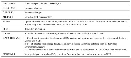 The update from HTAP_v3 to HTAP_v3.2 also provides the opportunity to respond to feedback from users of the original HTAP_v3 data, including the improvement of the regional datasets. These updates are described below. Major changes within each data source compared to HTAP_v3 are summarized in Table 5.