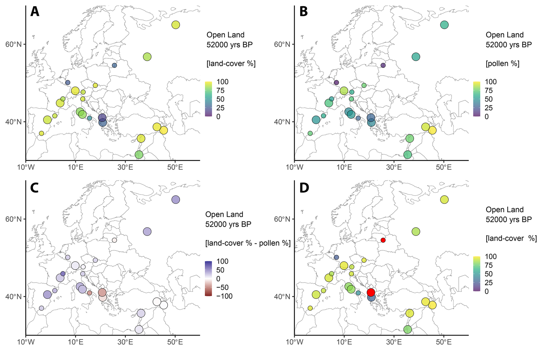 In the following, we focus on three critical intervals of the Last Glacial, using the LCT “open land” as proxy for vegetation openness: Stadial-interstadial variability, represented by GS-9 (39 ka BP) and GI-14 (52 ka BP), respectively, and the Last Glacial Maximum (LGM, 23 ka BP). To facilitate the comparison, we treat these climatic events as singular time slices centred around their respective mid-points (given in parentheses). Then, we compare the output of the REVEALS model with pollen percentages and highlight some of the major differences in the perception of palaeoenvironments. Lastly, we discuss the reliability of REVEALS estimates in the context of the REVEALS model design and its fundamental ideas.