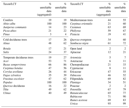 Overall, data aggregation decreased the number of unreliable REVEALS land-cover estimates from 48 % (raw pollen counts) to 40 % (aggregated pollen counts). The percentage of unreliable data was reduced drastically for almost all taxa and LCTSs. The biggest improvements occur for taxa with low to very low counting sums per sample, such as Carpinus orientalis (39 % more reliable), Buxus sempervirens (20 % more reliable), Acer (18 % more reliable). Exceptions are Poaceae (0.3 % less reliable) and Abies alba (no improvement). Among LCTs, the reliability of estimates for cold deciduous trees, temperate deciduous trees, and Mediterranean trees increases (9 %, 8 %, and 11 %, respectively), whereas the reliability of estimates for conifers decreases slightly (0.3 %). In conclusion, data aggregation has substantially improved to REVEALS land-cover estimates among less common taxa and LCTs, whereas estimates for the dominant taxa and LCTs remain virtually unchanged.