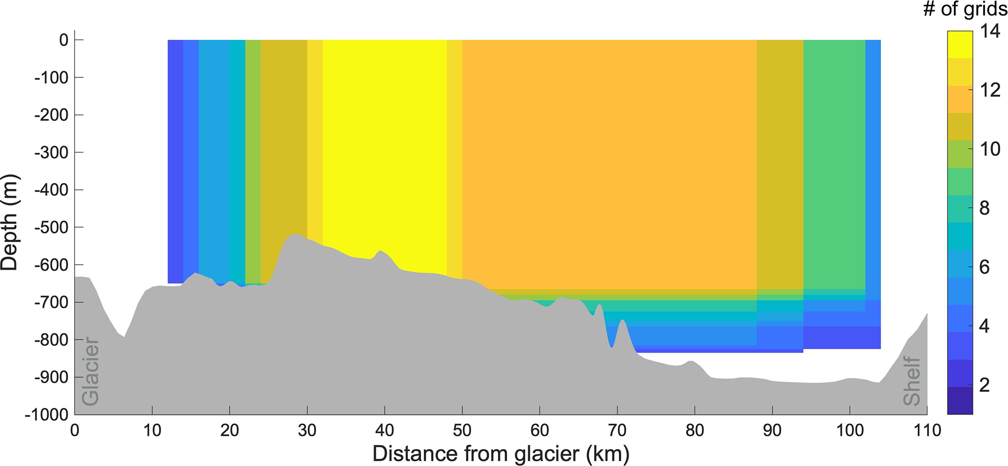 Figure 4The number of grids representing each survey that have data in each grid cell in the along-fjord standardized grid domain. The number in each grid cell is used to calculate the property mean and RMSD. Grid cell size is 2 km (horizontal) by 5 m (vertical). Grid cells with only 1 or 2 surveys of coverage have been removed.