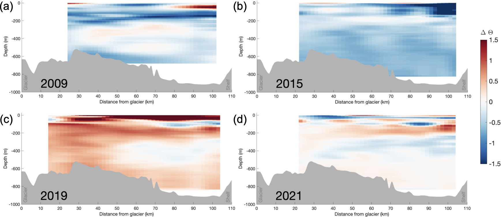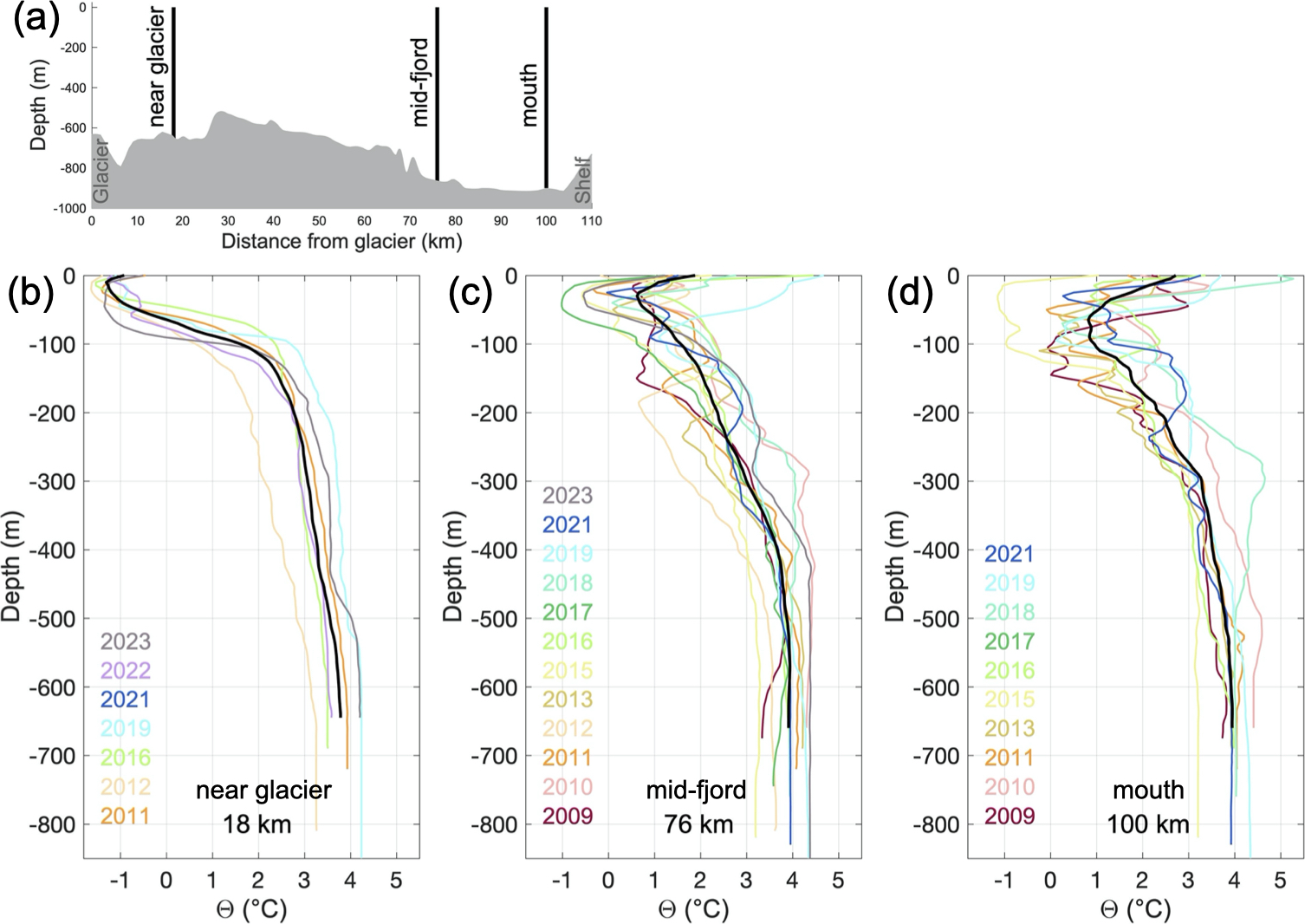 Profiles from the mid-fjord region for each survey show similarly variable interleaving and intrusion features as the mouth profiles, though the mid-fjord intrusions are less sharp overall. Some years, properties in the mid-fjord region are more similar to an average near glacier profile (2015, 2017, 2023) with <0 °C temperatures in the upper 50 m and exhibiting a strong thermocline between 50–100 m and relatively weak intrusions. Other years are more similar to a mouth profile (2011, 2012, 2021) with warmer surface waters and multiple stronger intrusions. The along-fjord location of the transition between near glacier properties and mouth properties varies from year to year. This variability is not captured in the time mean mid-fjord profile and climatology of the mid-fjord region.