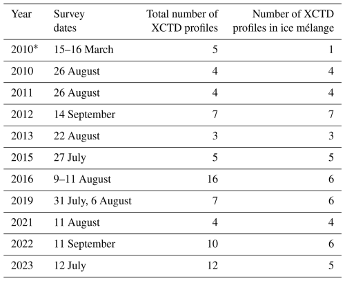 Table 2Information about each XCTD survey in Sermilik Fjord. * One winter survey was conducted on 15–16 March 2010 (Straneo et al., 2011). These profile data are available, but have not been gridded or included in the summer season climatology.