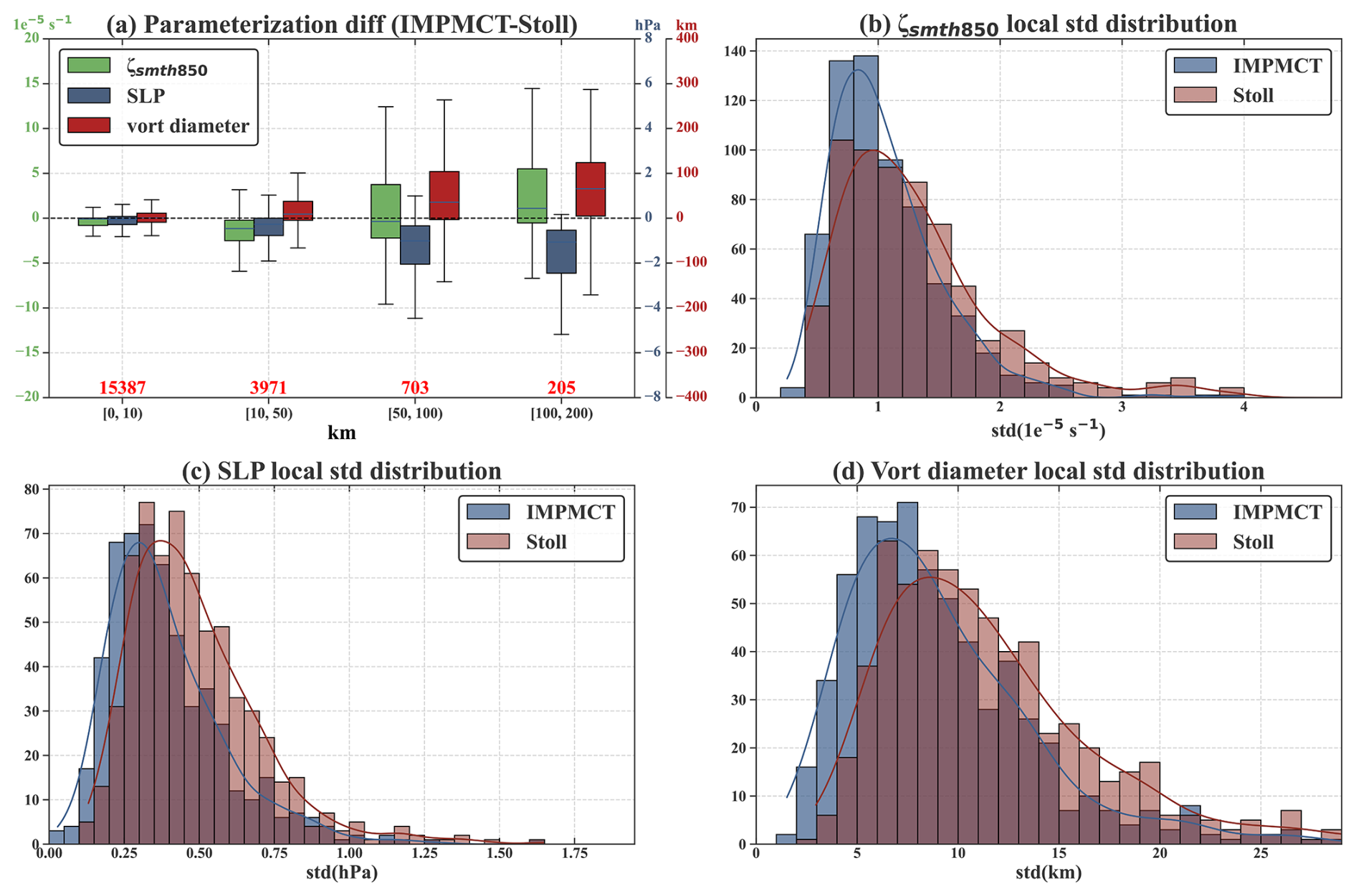Figure 16Frequency distribution of bias in (a) Track-max near-surface wind speed and (b) diameter between matched cyclones in the Rojo and IMPMCT datasets (Rojo minus IMPMCT). The cyclone diameter in IMPMCT is calculated as the average of the width and length of the bounding box enclosing the cyclone.