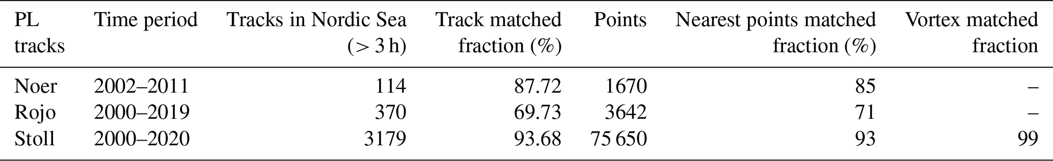 First, to validate the accuracy of the vortex track datasets obtained from the vortices tracking algorithm, they are compared with the manually identified PL lists published by Noer et al. (2011), Rojo et al. (2015, 2019), and the objectively derived PL track datasets from reanalysis data by Stoll (2022). All reference datasets are spatially and temporally co-located with our derived tracks, retaining only those persisting for  3 h. We applied the following matching criteria: a vortex track is considered matched with a PL track if more than 50 % of temporally coincident track points (within ±1 h) fall within a 150 km radius (applying an 80 % threshold for Stoll's dataset). To avoid spurious matches of short-lived spurious tracks, only vortex tracks with lifespans exceeding 60 % of the corresponding reference PL track's duration were included. A single vortex track was permitted to match multiple PL tracks from reference datasets, provided that these PL tracks did not overlap temporally and each was uniquely paired with its nearest vortex track. As presented in Table 2, the validation results demonstrate strong agreement with Stoll's dataset, confirming the robustness of our vortex tracking algorithm. Moreover we achieve higher matching rates with manual PL lists by using lower vortex identification thresholds, which further underscores the improved capability of ERA5 reanalysis data in representing PL characteristics. Additional validation using tracks from the sensitivity experiment (Sect. 3.1) revealed a critical insight: vortex tracks derived under lenient thresholds consistently produced higher matching rates when compared against established PL datasets (Table S2). This suggests that some PLs exhibit weaker vorticity signals in the lower atmosphere, highlighting intrinsic intensity diversity that stricter thresholds may fail to capture.