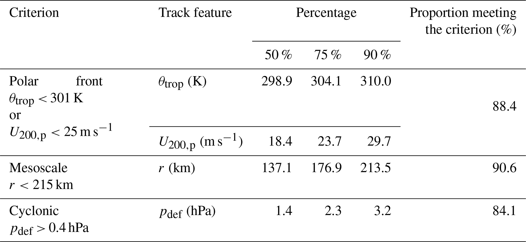 1. Polar-front criterion. As PMCs are defined as mesoscale cyclones forming north of the polar front (Rasmussen and Turner, 2003), we employ two indicators to distinguish polar air masses from extratropical air masses: tropopause potential temperature (θtrop) and the maximum poleward value of 200 hPa wind speed (U200,p). For each cyclone, we compute the track-averaged θtrop averaged within a 250 km radius of the cyclone center and the track-averaged U200,p within a longitudinal band of ±1.0° great-circle distance. Following Stoll (2022), θtrop< 300.8 K is used to identify polar air mass origin. This threshold effectively distinguishes PLs from extratropical cyclones, retaining 76 % of systems across subjective archives while capturing 90 % of known PLs. Han and Ullrich (2025) employed U200,p< 25 m s−1 to position PLs north of the polar jet, achieving an approximately 80 % hit rate for PL classification with a miss rate of only 11.9 %.