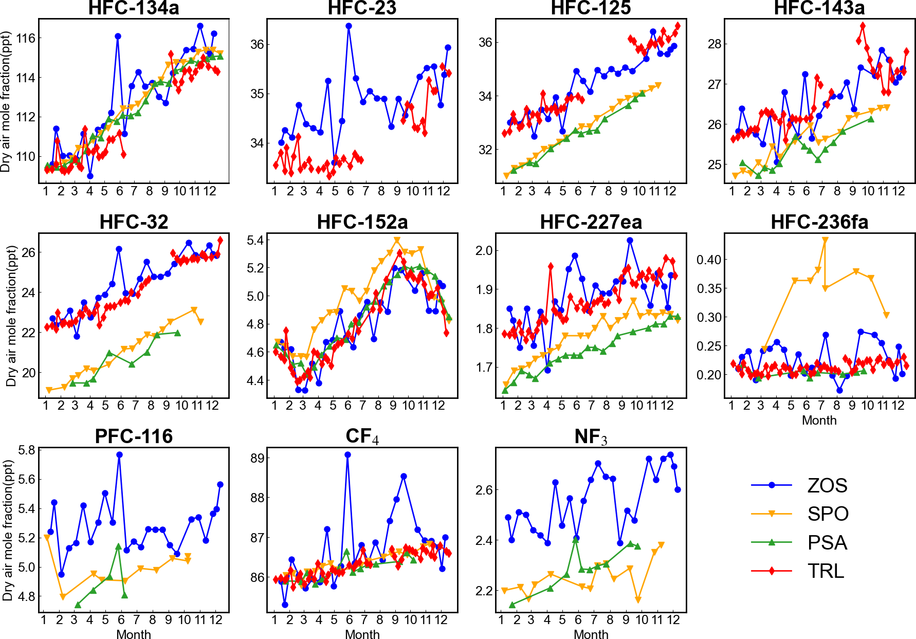 Since 1977, the NOAA/ESRL has analyzed minor atmospheric constituents sampled at 12 remote stations (Montzka et al., 2015; Takeda et al., 2021). The Advanced Global Atmospheric Gases Experiment (AGAGE) and its precursors have been pivotal in measuring and analyzing the composition of the global atmosphere, providing critical data for understanding climate change and environmental monitoring since 1978. AGAGE is distinguished by its ability to measure all important species identified in the MP and the major non-CO2 greenhouse gases at the global scale, at a high frequency, and at multiple stations. These substances exhibit atmospheric abundance levels ranging from the ppm (parts per million, i.e., one in 106) scale down to the ppq (parts per quadrillion, i.e., one in 1015) scale. Global monitoring revealed that under the control of the MP, the Kyoto Protocol, and the United Nations Framework Convention on Climate Change (UNFCCC), the CFC concentration decreased, the growth rate of HCFCs initially decreased and then stabilized, and the HFC concentration continued to increase (Yi et al., 2021, 2023).