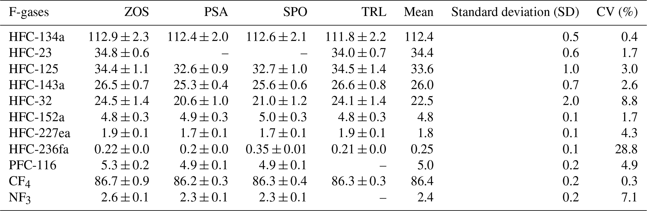 The coefficient of variation (CV; Table 2) of the annual mean concentration at these four stations was calculated. The mean CV value was 3.16 % (except HFC-236fa), which is below the 5 % threshold suggested by Jalilibal et al. (2021). Consequently, the data from ZOS can be considered representative of the background atmospheric composition in Antarctica, especially in East Antarctica.