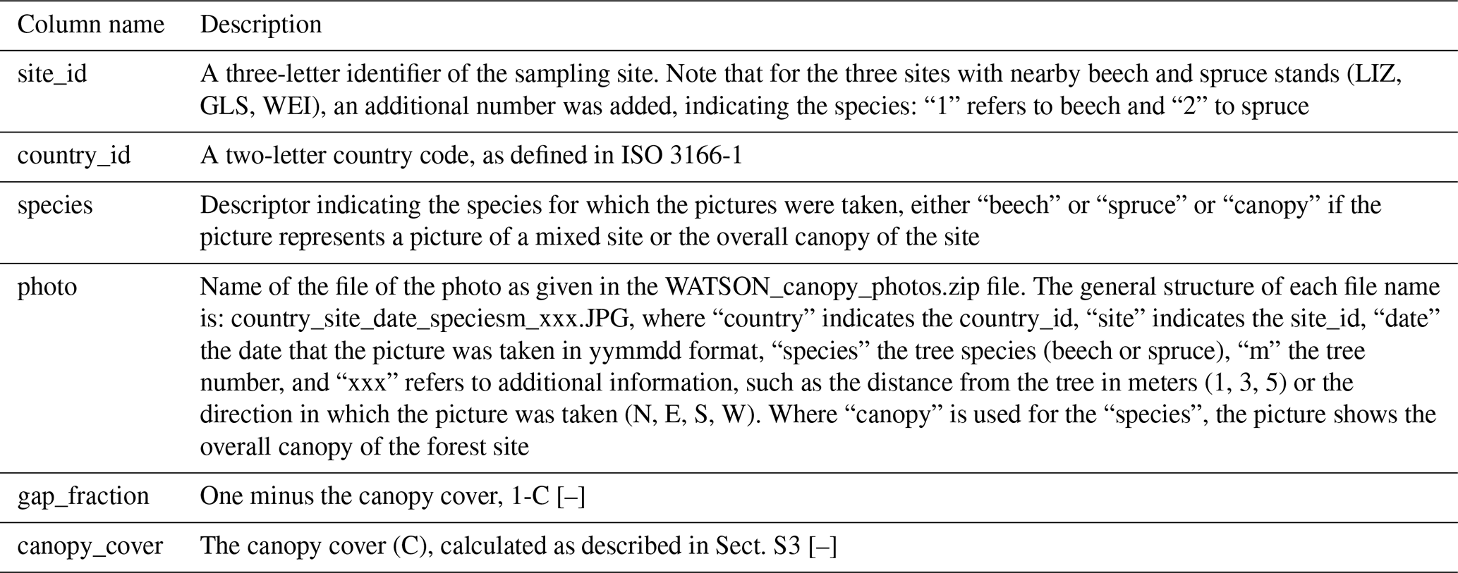 The dataset consists of three comma-separated files (.csv) and one zip file (.zip) with photos of the canopy at the sampling sites. All .csv files are encoded in UTF-8 and use commas as delimiters. The first datafile (“WATSON_Metadata.csv”) contains all the metadata about the sampling sites including site-, soil- and tree-specific information (Table 2). The second file (“WATSON_Isotopedata.csv”) contains the information about sample weights, cryogenic water extraction and the actual hydrogen and oxygen isotope data (Table 3). The third file (“WATSON_Canopydata.csv”) contains the information on the canopy cover (Table 4). The photos on which the canopy cover data are based are stored in the “WATSON_Canopy_Pictures.zip” file. Datasets can be linked by the site_id, a three-letter identifier representing each sampling site.