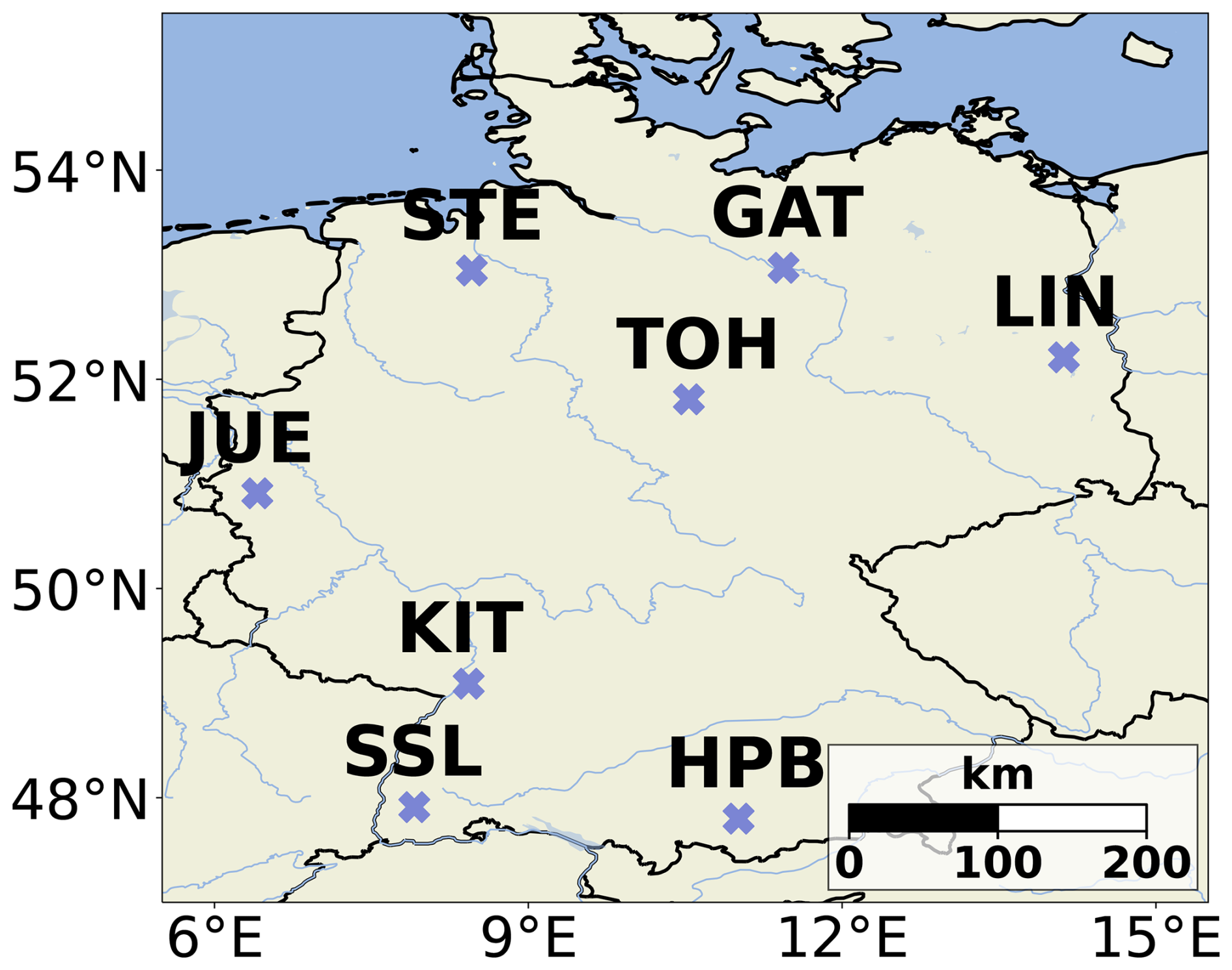 Radon progeny observations with the Heidelberg Radon Monitor (HRM) are conducted at eight ICOS atmosphere stations in Germany. All these ICOS atmosphere stations are operated and managed by the Meteorological Observatory Hohenpeißenberg of the German Meteorological Service (DWD), except for the station Schauinsland (SSL), which is run by the German Environment Agency (Umweltbundesamt, UBA). The stations are listed in Table 1 together with their coordinates and intake heights. A map of Germany (Fig. 1) shows their almost even distribution across the country. Except for Schauinsland, a mountain station in the Black Forest (1205 ), where the air intake is about 12 m above ground level (a.g.l.), all other 222Rn progeny measurements are conducted at towers from intake heights between 93–132 . The Torfhaus and Hohenpeißenberg towers are located on top of moderately high hills in the Harz (Torfhaus, 801 ) and in the pre-alpine region of southern Germany (Hohenpeißenberg, 934 ). All other stations are located in flat terrain at altitudes above sea level (a.s.l.) between 29–110 m. Detailed information about all (German) ICOS stations is available at the ICOS Carbon Portal (https://www.icos-cp.eu/observations/atmosphere/stations, last access: 10 September 2025).