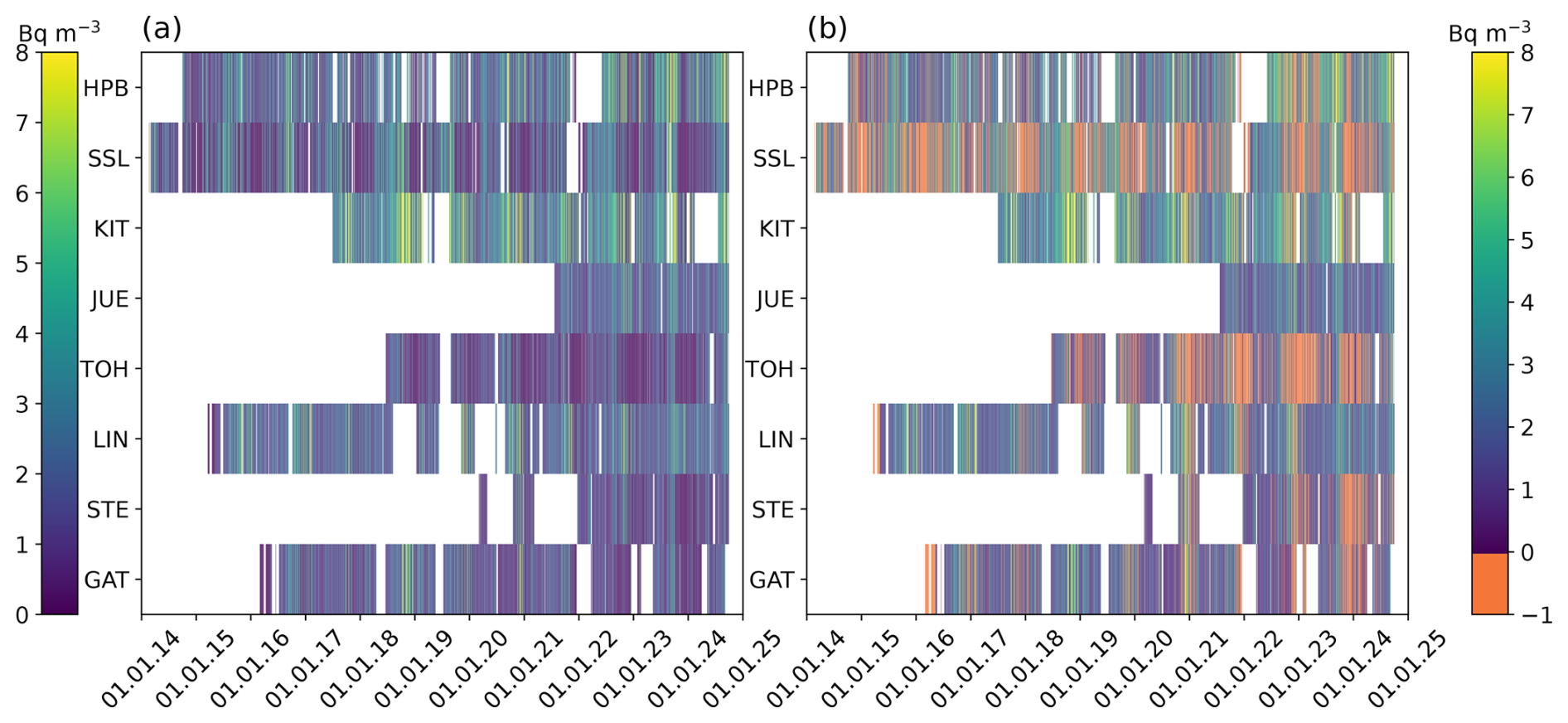 Figure 4Panel (a) shows daily mean atmospheric 214Po activity concentrations in Bq m−3 at German ICOS stations. The daily values are plotted only if more than 70 % of the hourly data were available. Panel (b) shows all valid data where measurements were conducted at RH below the respective thresholds and thus represent the best estimates of the RH-selected 222Rn data. The periods where less than 70 % of the hourly data remained after flagging are shown in orange (with values of −1).