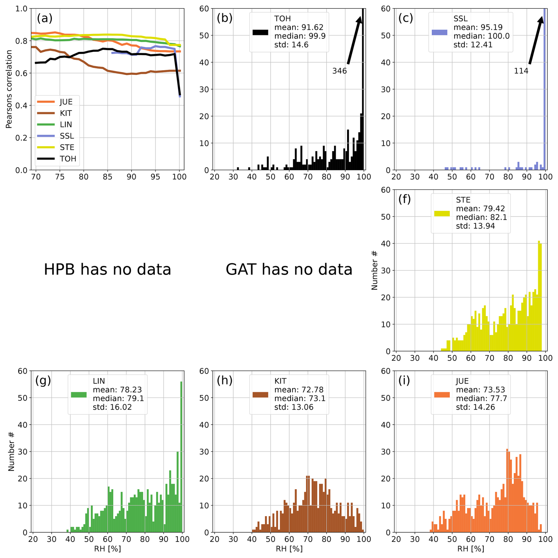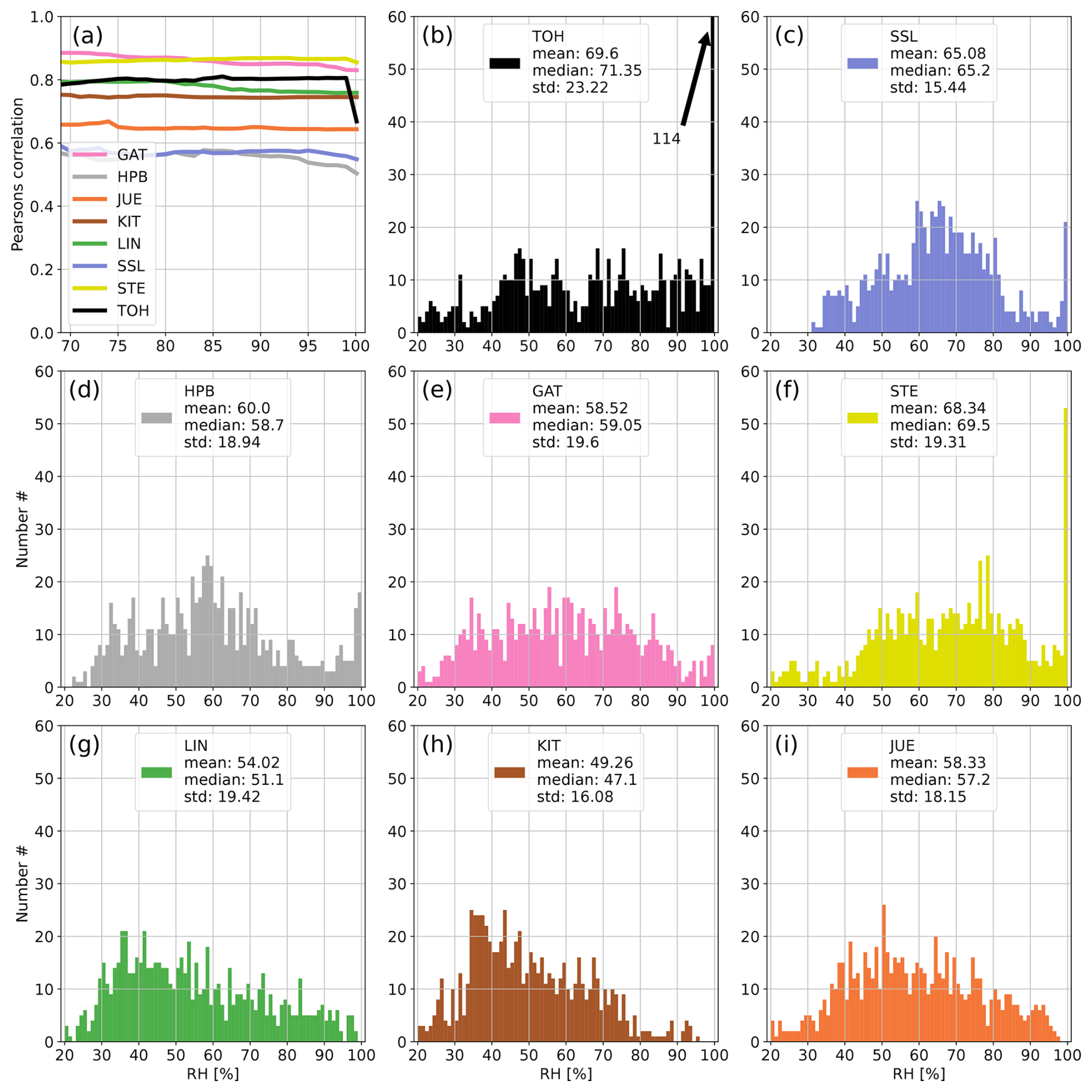 Figure A7Panel (a) shows the development of the correlation coefficient between 214Po observations and simulated 222Rn data at all German ICOS stations if data with increasing RH are successively included in the calculation of the correlation. Panels (b)–(i) show the distributions of hourly RH values at the stations of the network. The arrows with numbers indicate values that exceed the y-axis range (usually for high RH). For each station the correlation coefficient was calculated only if the number of filtered data points was higher than 10 % of all values for the given month to avoid the stochastic behavior of the curves in the first subplot associated with small datasets. July 2022.