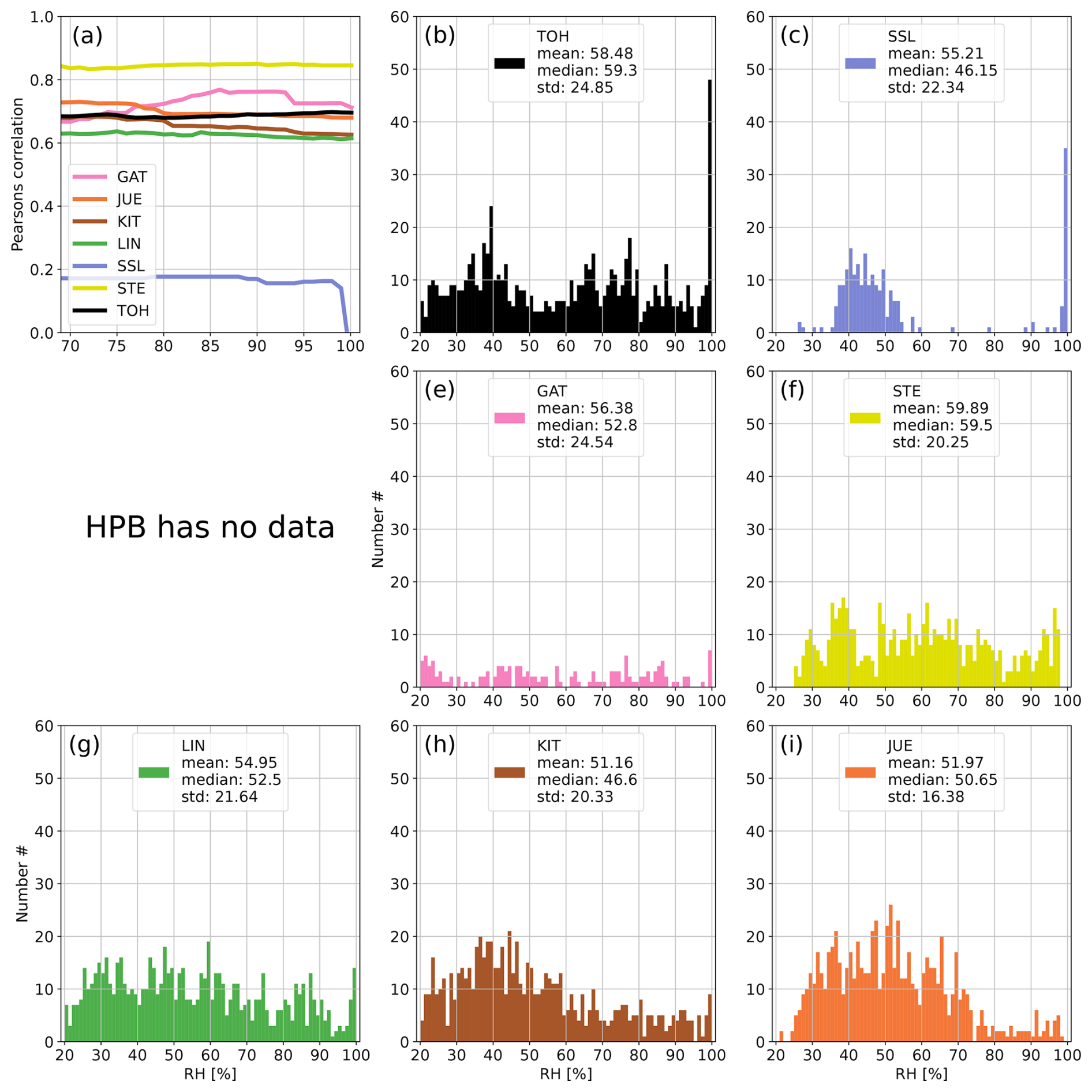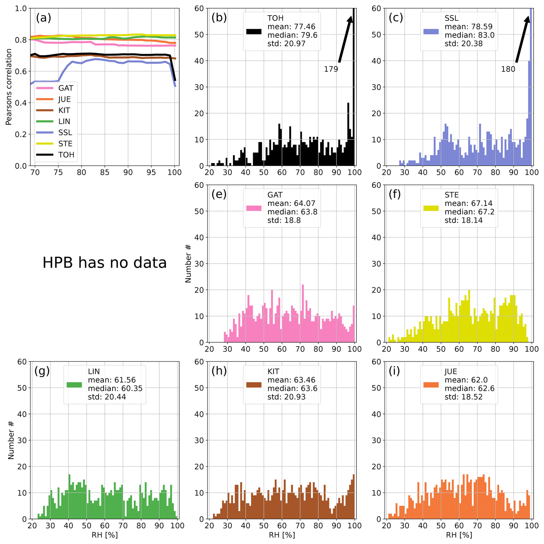 Figure A9Panel (a) shows the development of the correlation coefficient between 214Po observations and simulated 222Rn data at all German ICOS stations if data with increasing RH are successively included in the calculation of the correlation. Panels (b)–(i) show the distributions of hourly RH values at the stations of the network. The arrows with numbers indicate values that exceed the y-axis range (usually for high RH). For each station the correlation coefficient was calculated only if the number of filtered data points was higher than 10 % of all values for the given month to avoid the stochastic behavior of the curves in the first subplot associated with small datasets. September 2022.