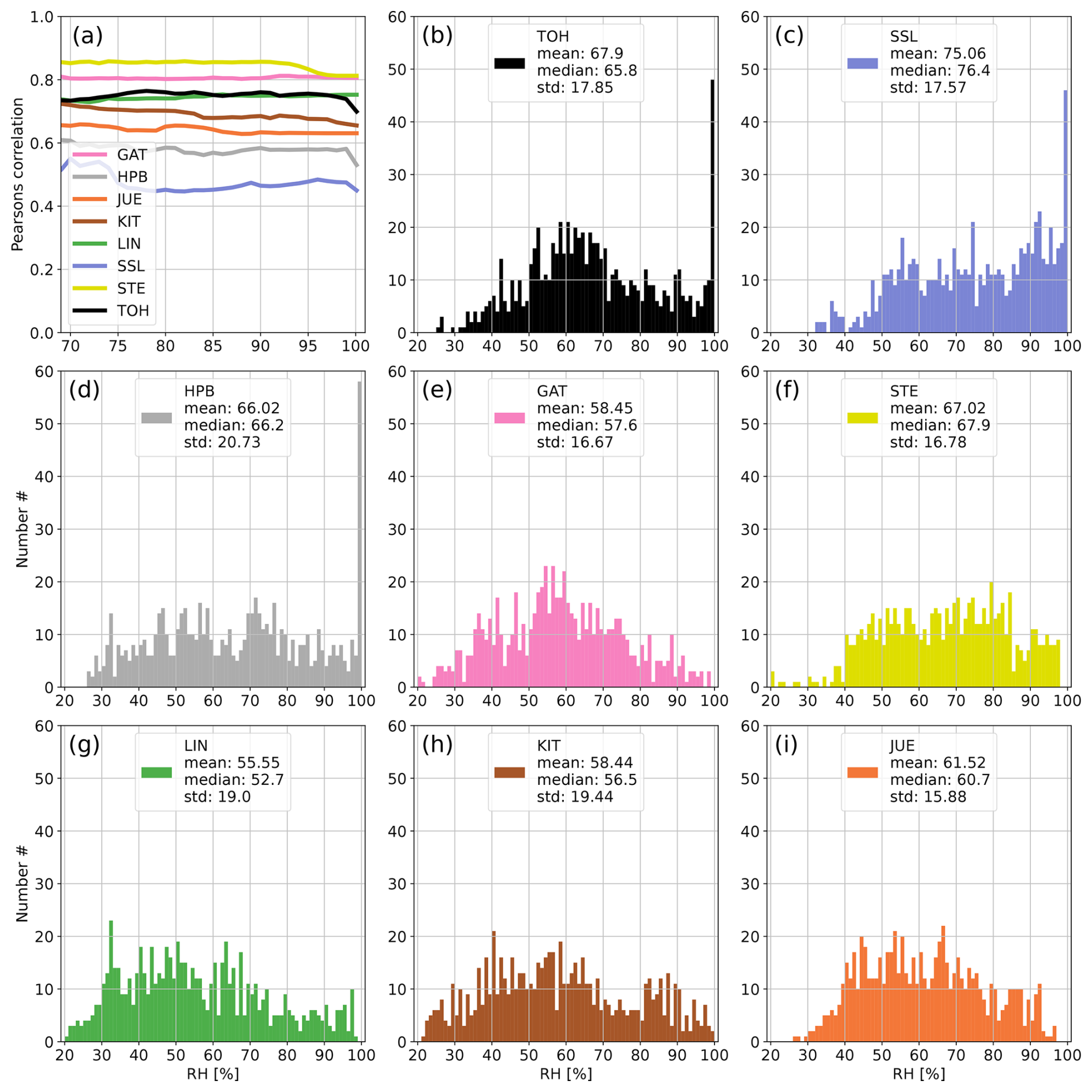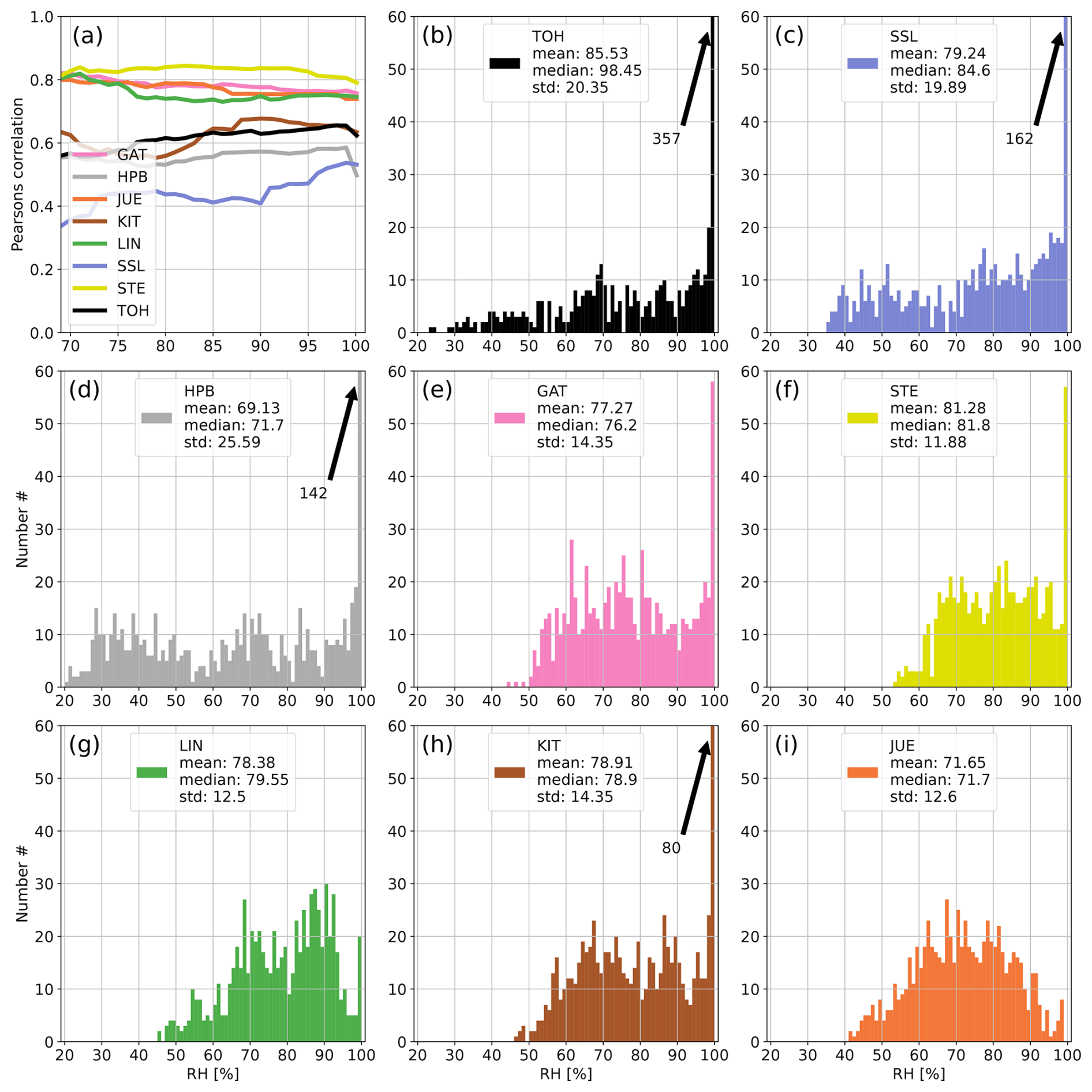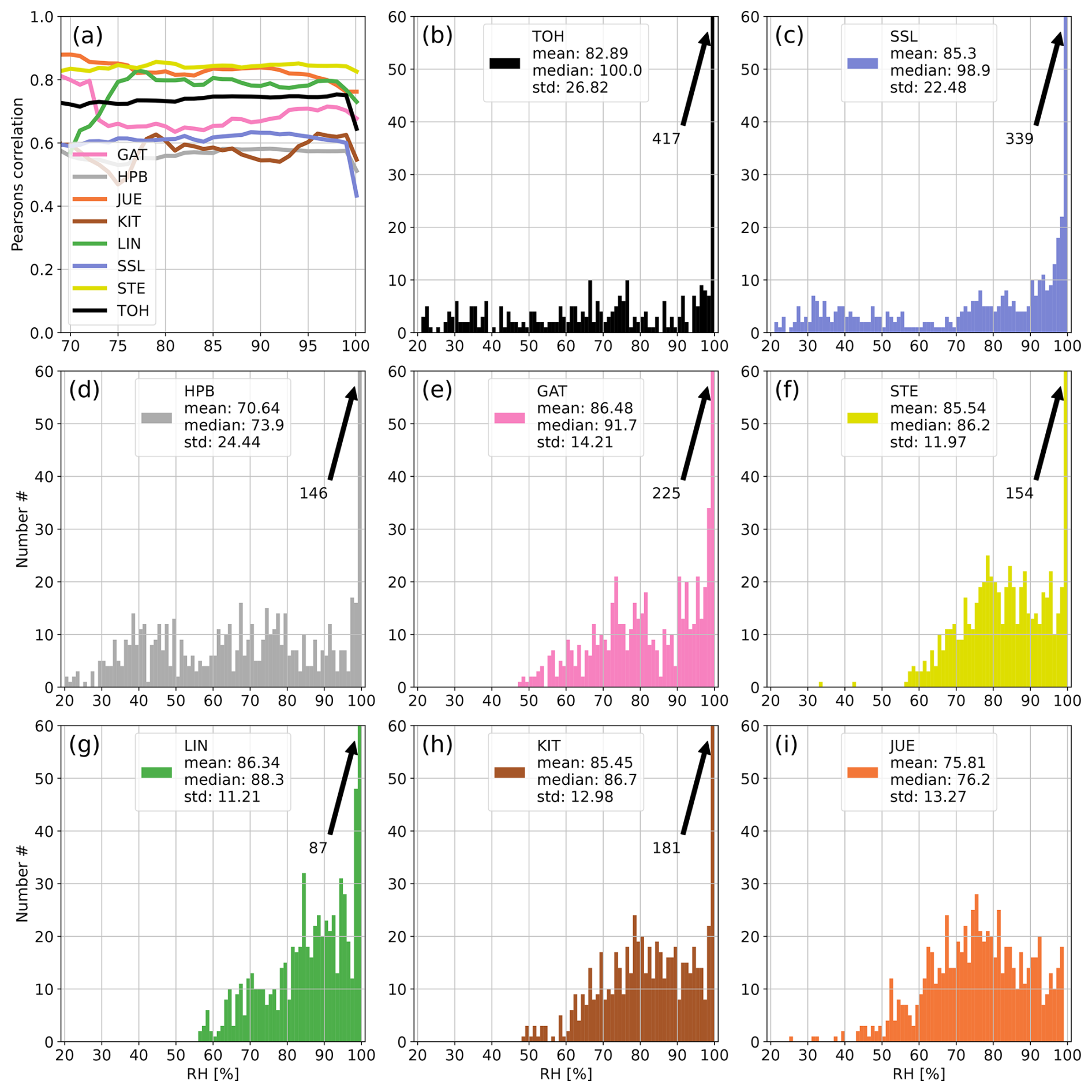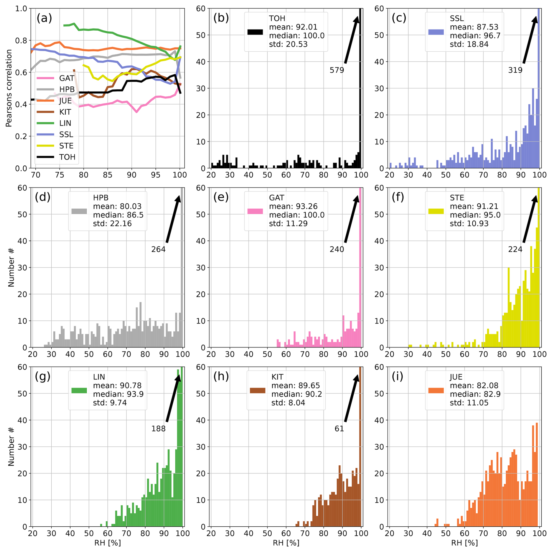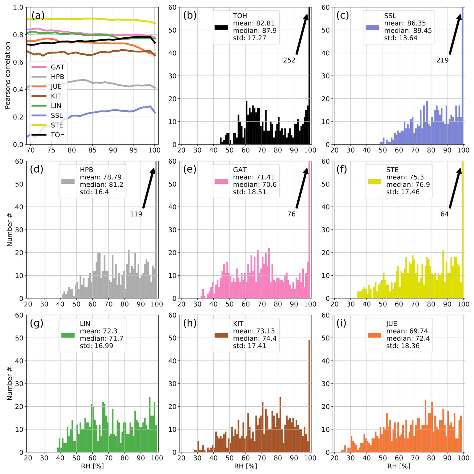 Figure A4Panel (a) shows the development of the correlation coefficient between 214Po observations and simulated 222Rn data at all German ICOS stations if data with increasing RH are successively included in the calculation of the correlation. Panels (b)–(i) show the distributions of hourly RH values at the stations of the network. The arrows with numbers indicate values that exceed the y-axis range (usually for high RH). For each station the correlation coefficient was calculated only if the number of filtered data points was higher than 10 % of all values for the given month to avoid the stochastic behavior of the curves in the first subplot associated with small datasets. April 2022.