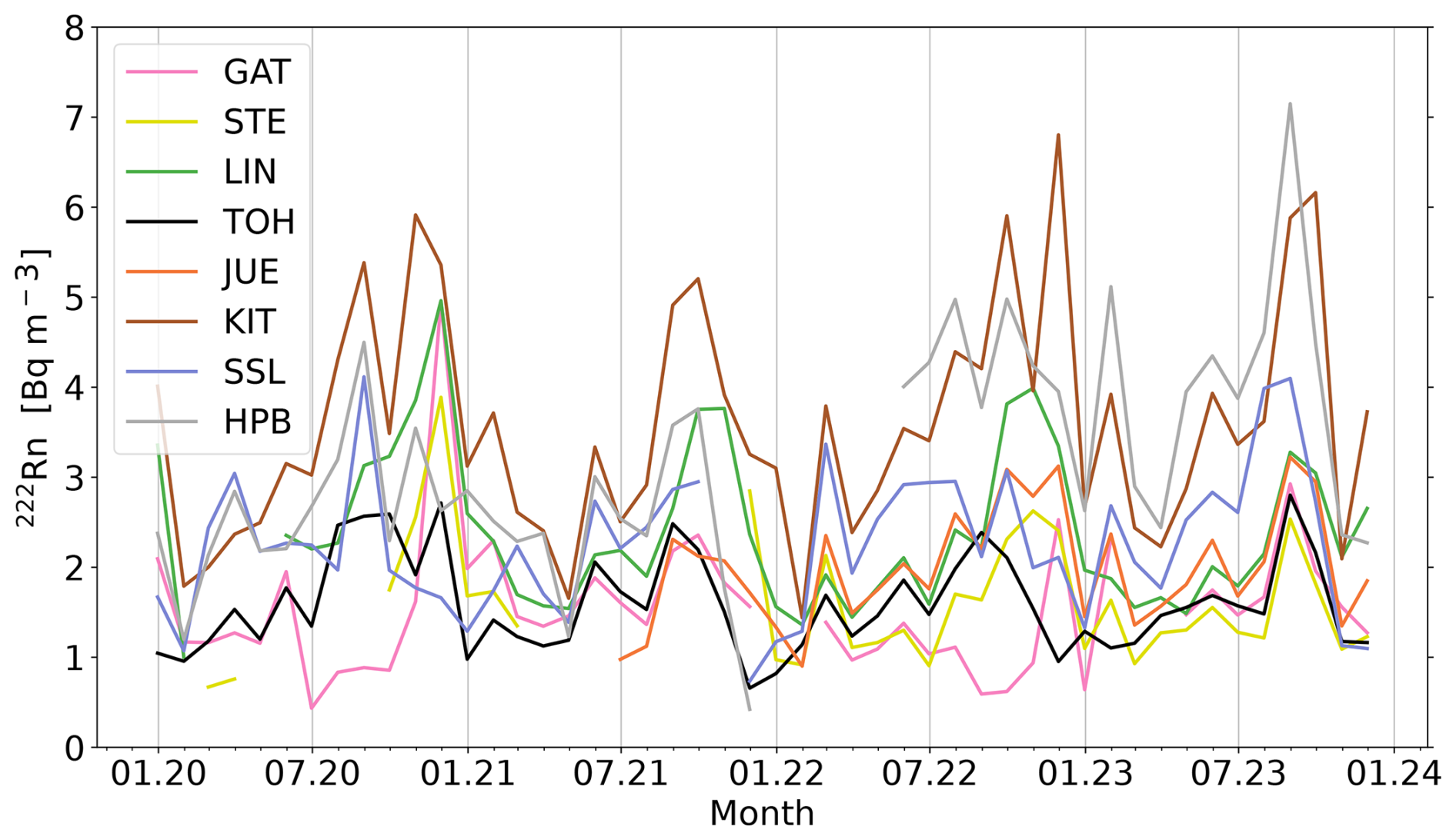 Figure 5Seasonal cycle of 222Rn monthly means at KIT, SSL, and LIN in the time period of 2020–2023. Note that monthly values are only shown if more than 70 % of the daily mean values were available for the respective month.