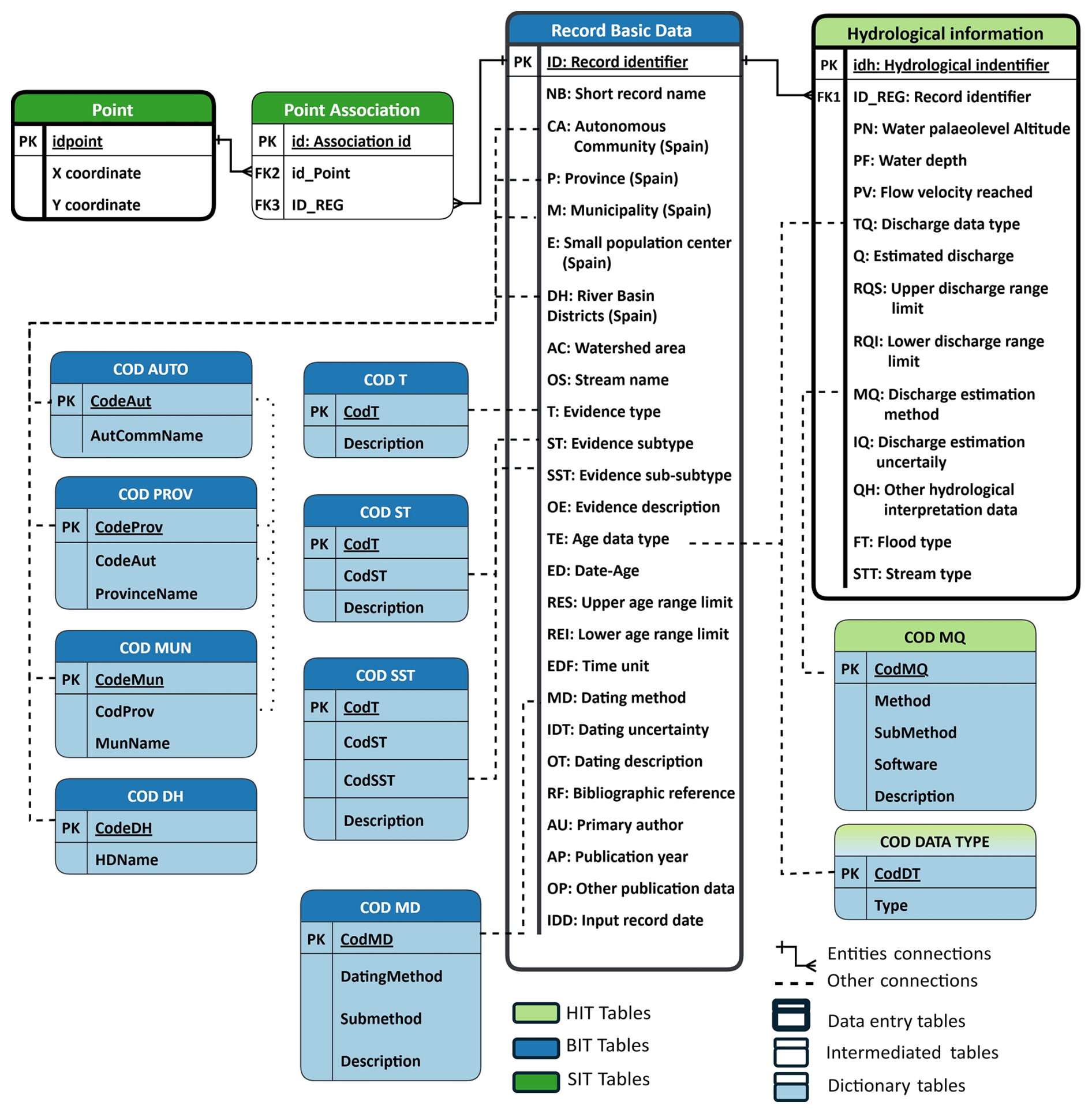 Figure 2PaleoRiada Database Physical Structure. BIT: Basic Information Tables, SIT: Spatial Information Tables, HIT: Hydrology-related Tables.
