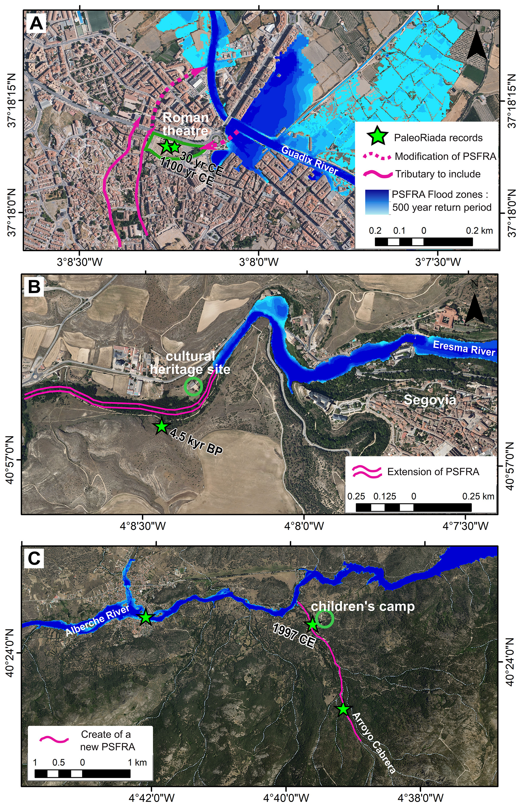 In the Guadalquivir River Basin, the PSFRA in the Guadix Town (Granada) was initially defined based on the 1973 flood event of the Guadix River. However, PaleoRiada reveals two palaeoflood events (Roman period, 1st century AD, and Almohad period, 12th century AD) located just outside the current PSFRA boundary. These events, caused by the Almorejo stream (Díez-Herrero et al., 2024), could be considered to adjust the PSFRA boundary (including this tributary), reflecting a more accurate flood risk based on long-term flood patterns (Fig. 6A).