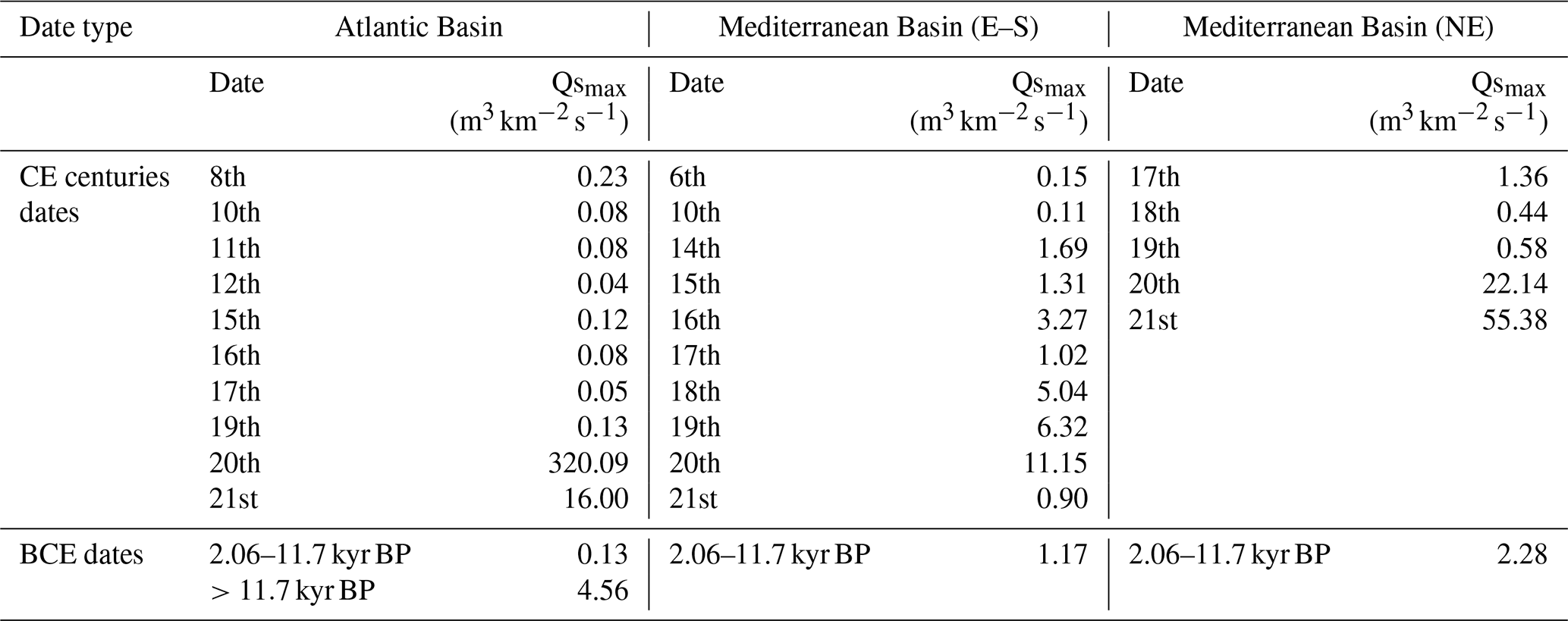 Table 6Maximum Specific Discharge Values (Qsmax) recorded in the PaleoRiada dataset grouped by time interval and basins.