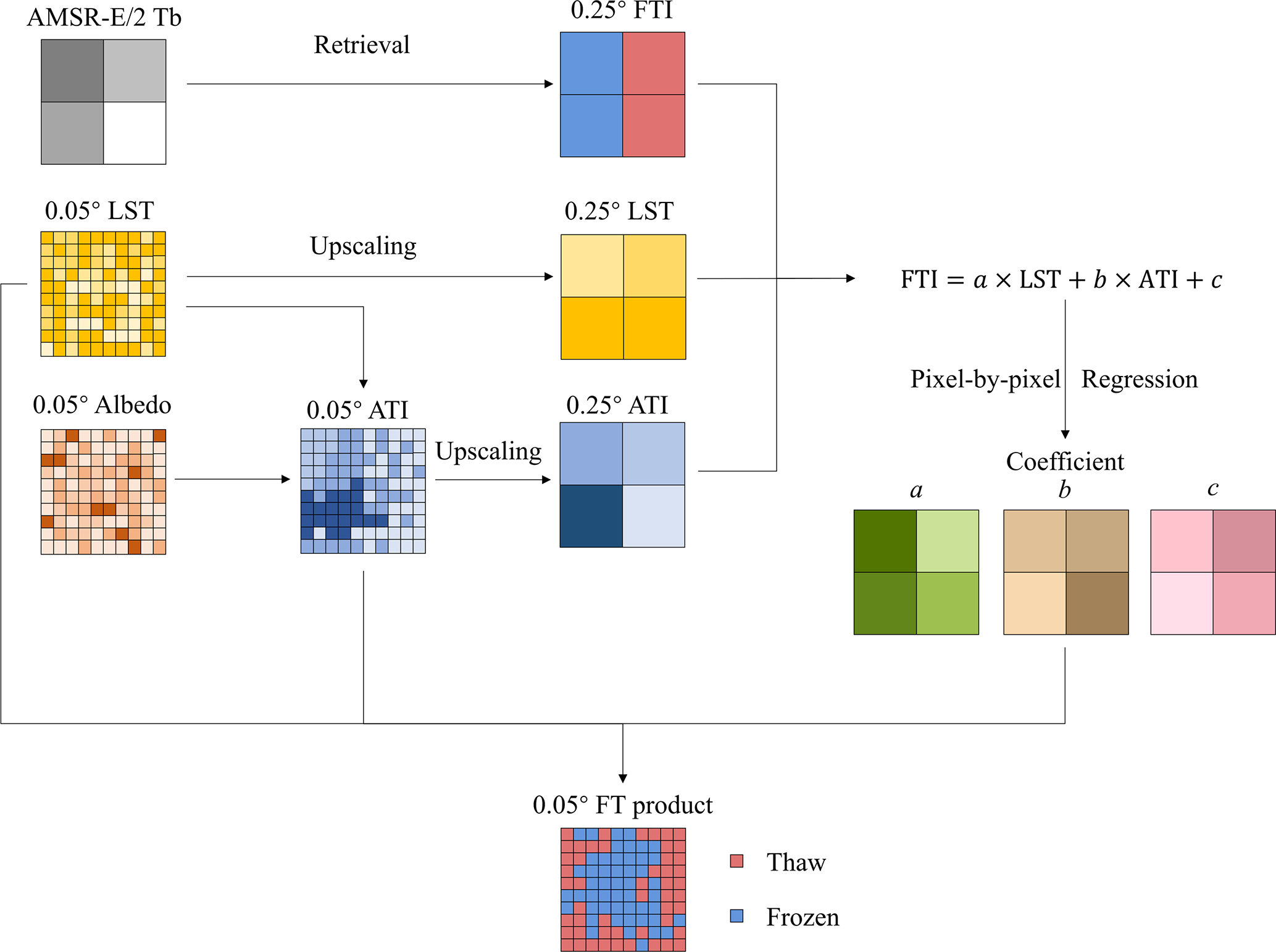 The 0.05° LST and ATI data were resampled to align with the lower 0.25° resolution of the microwave-derived FTI. This resampling process involved averaging the data across 5×5 grid cells.
