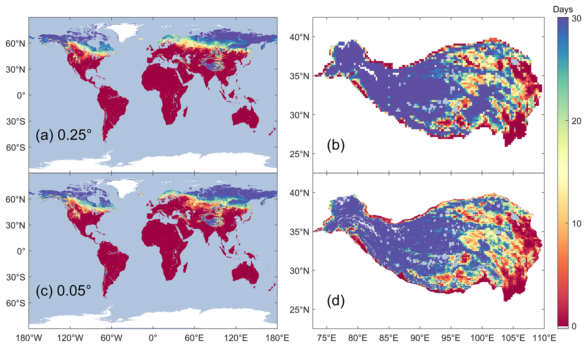 Figure 5Maps of frost days in April 2019 for (a) the global scale and (b) the Qinghai-Tibet Plateau, derived from microwave data with a 0.25° spatial resolution during the descending orbit time. Additionally, panels (c) and (d) show the same conditions in the downscaled descending FT product at a resolution of 0.05°.