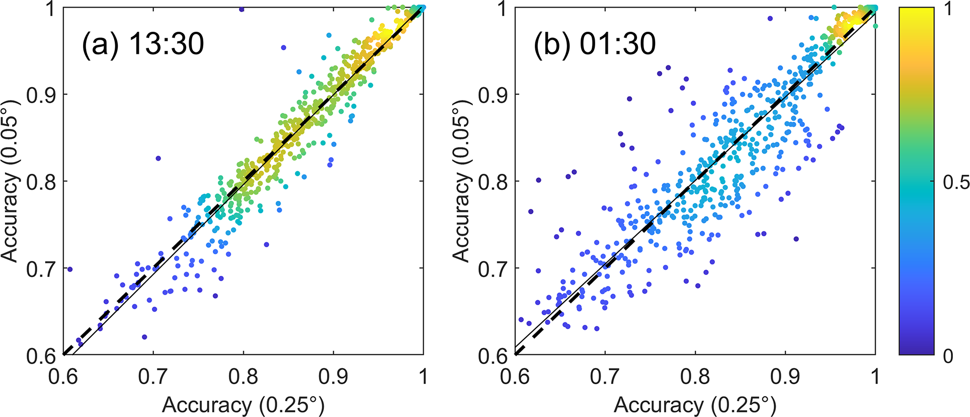 Accuracy was calculated separately for the 0.25 and 0.05° FT products. The validation process, illustrated in Fig. 3, was conducted using a single, larger 0.25° grid cell as an example.