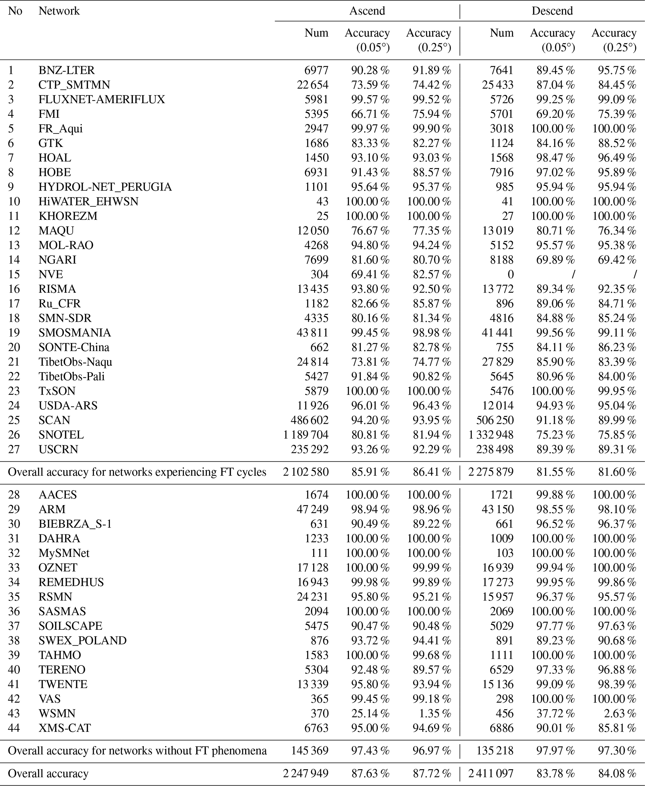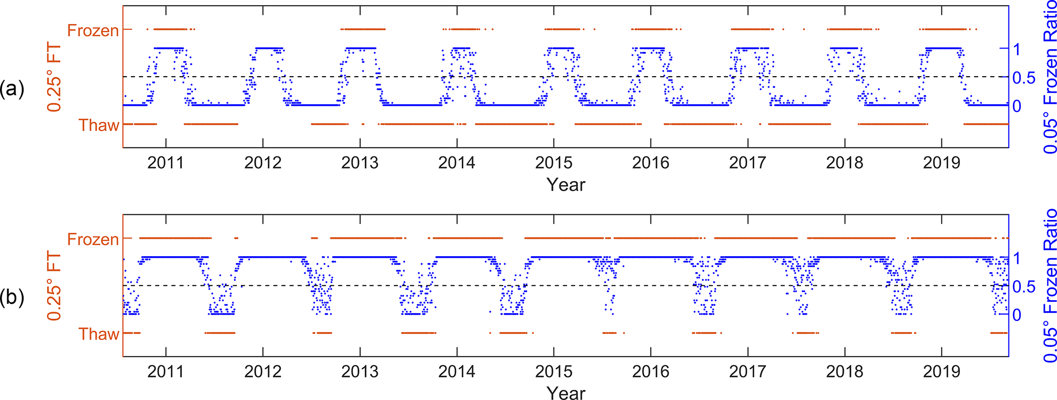 The FT classification results for the larger grid cell from both products were validated using in situ data. For the 0.25° product, the FT classification of the grid cell was directly compared to the in situ observation results. For the 0.05° product, each 0.25° grid cell contains 25 pixels. If the majority of these pixels (i.e. more than 13) were classified as frozen, the entire grid cell was labelled as frozen in the 0.05° product; otherwise, it was labelled as thawed.