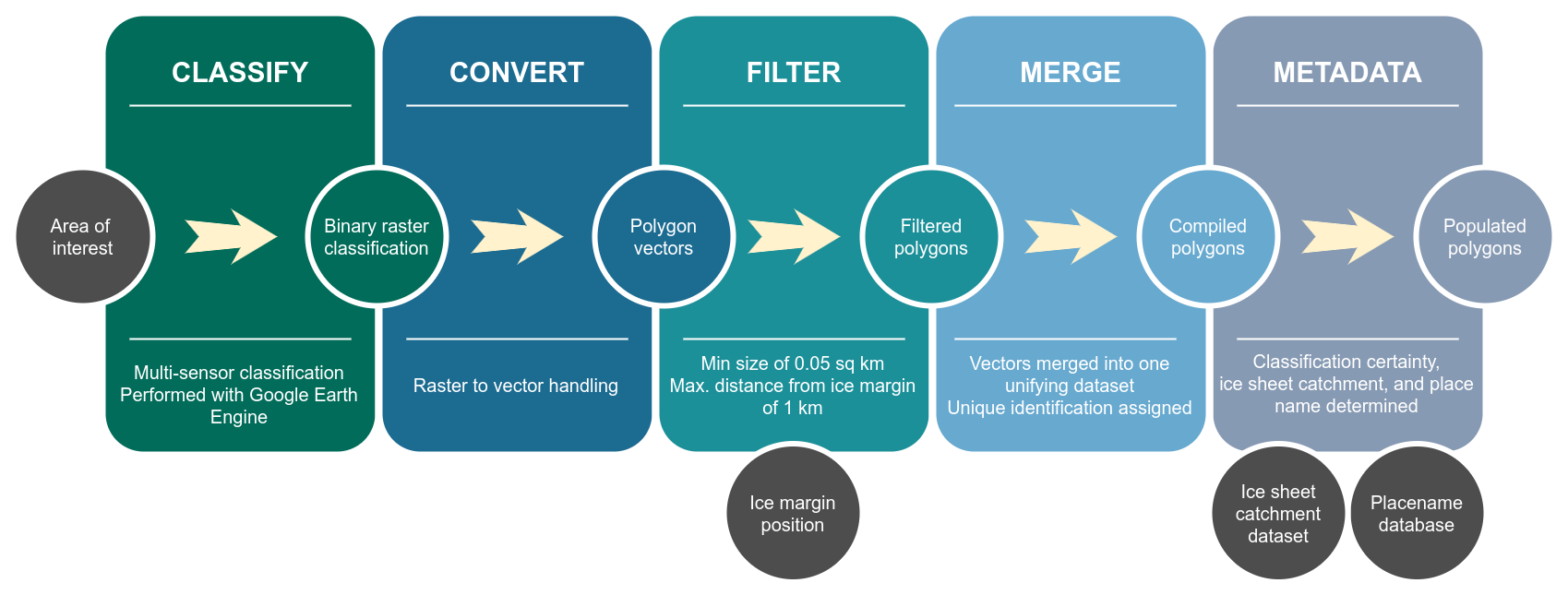 Figure 2A visualisation of the processing workflow for the generation of the ice-marginal lake inventory series, including components performed with © Google Earth Engine (“Classify”) and the Python package GrIML (How, 2025b), which utilises Python spatial data handling packages geopandas (Jordahl et al., 2020) and rasterio (The Rasterio development team, 2013–o). The workflow is based on How et al. (2021). The annotated rectangles refer to process stages (reading from left to right), the coloured annotated circles represent intermediary outputs to the corresponding process stages in the workflow, and the grey annotated circles represent workflow inputs.