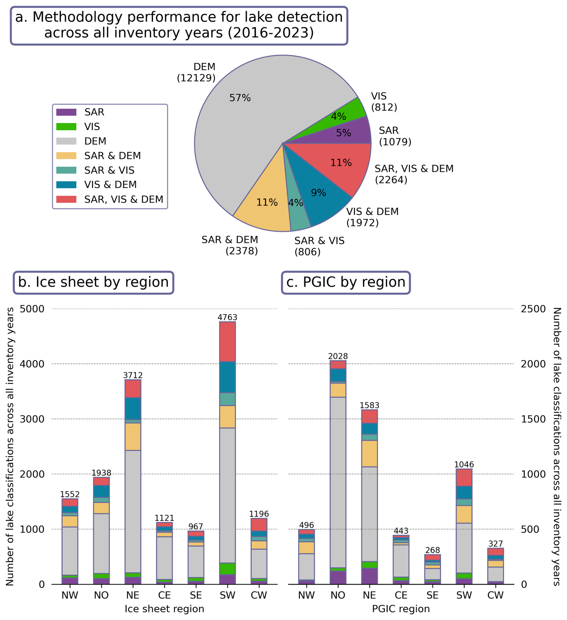 Figure 8Lake classifications by method across the ice-marginal lake inventory series, with an overview of lake classifications over all inventory years (a) and classifications by region for lakes adjacent to the ice sheet (b) and the PGICs (c). SAR refers to the SAR backscatter classification method from Sentinel-1 imagery, VIS refers to the multi-spectral classification method from Sentinel-2 imagery, DEM refers to the DEM sink detection method from the ArcticDEM, and listed methods refer to instances where more than one method has been used to classify a lake (e.g. “SAR & DEM”, “SAR, VIS & DEM”). The legend and colour scheme in (a) correspond to (b) and (c). Values in brackets in (a) are the absolute number of lakes corresponding to the provided percentages. The values printed on top of the bars in (b) are the total number of classifications in the given region.