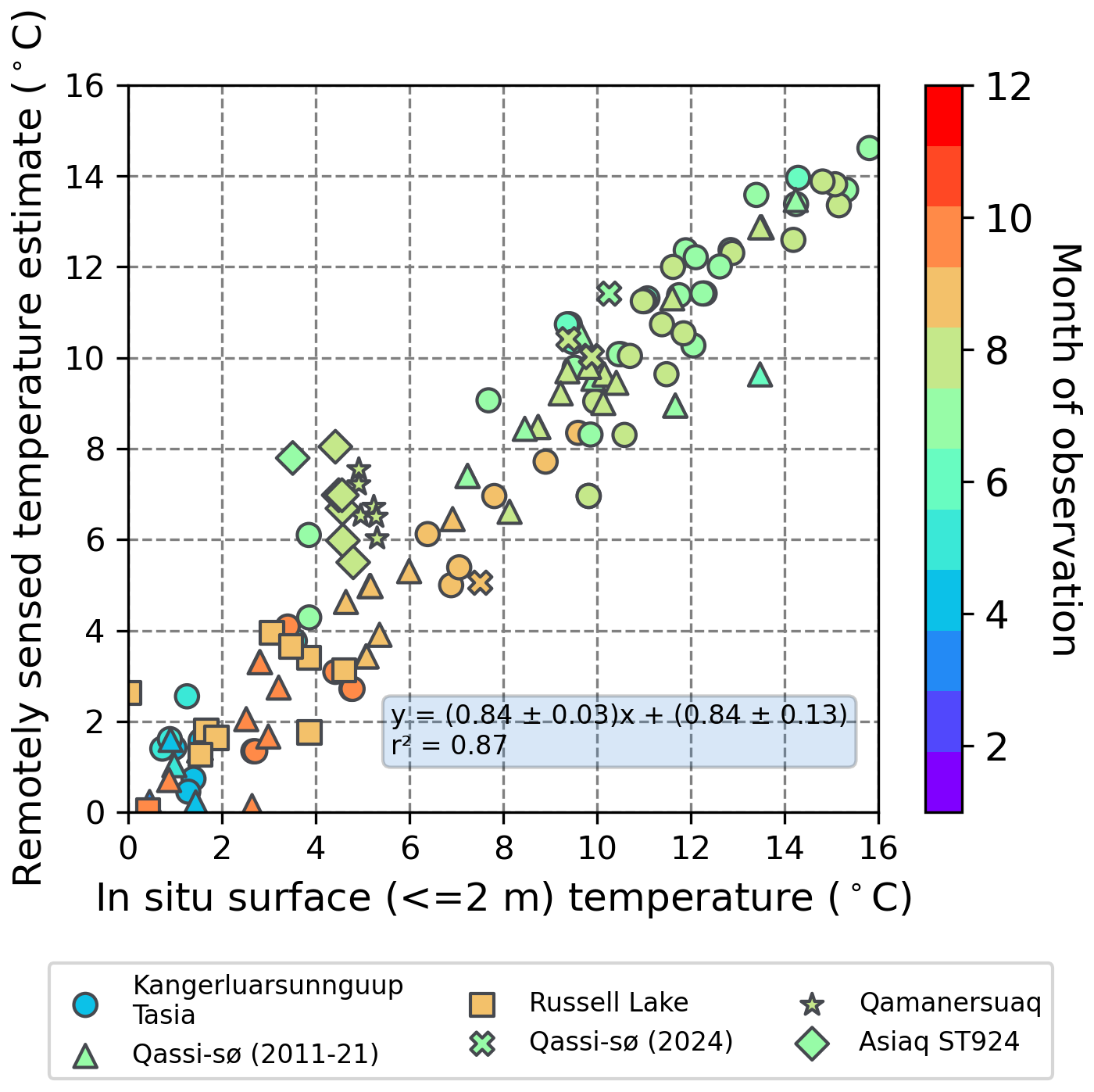 Ideally, a correction factor specifically for calibrating values to Greenland lakes would be adopted. However, in situ validation datasets in Greenland are sparse and the derived correction factor appears to agree well with the limited datasets available. In the future, more in situ observations would strengthen the assessment, with a possibility to derive a Greenland-specific correction scheme. In addition, the influence of ice presence is limited based on the selection of strictly summer scene acquisitions and removing temperatures below 0 °C. In future work, icebergs and ice cover could be explicitly removed before a temperature estimate is derived to reduce the influence of their presence. This is currently beyond the scope of the dataset given the challenges with classifying the presence of ice on lakes across large regions in the Arctic (e.g., Carrea et al., 2025; Dye et al., 2025).