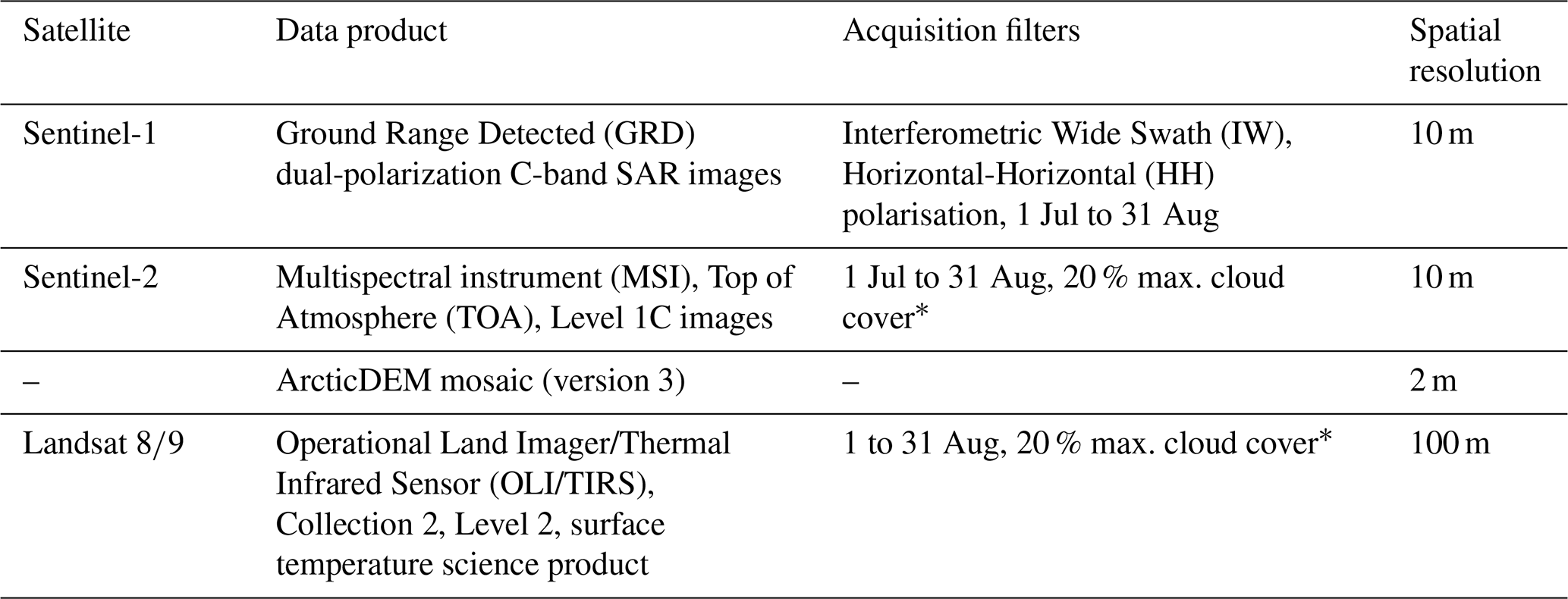 Water bodies were classified from Sentinel-2 MSI (Multispectral Imager), TOA (Top-Of-Atmosphere), Level-1C scenes acquired for the summer months (1 July to 31 August) of each inventory year (2016 to 2023) with a maximum cloud cover of 20 % (Table 2). Clouds were masked using the cloud mask provided with each scene (QA60), masking out opaque and cirrus clouds. The bands of interest were extracted, specifically blue (B2), green (B3), red (B4), near-infrared (B8), and the two shortwave infrared bands (B11, B12) (Table 3). The shortwave infrared bands were resampled from 60 to 10 m spatial resolution, and then averaged band mosaics were produced from all summer scenes for each inventory year.