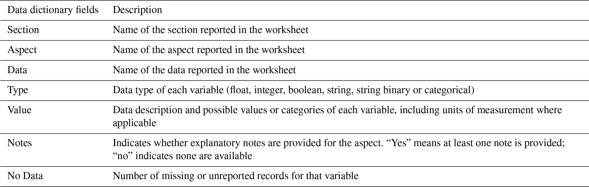 The data dictionary is provided as an Excel workbook and summarizes the metadata associated with each variable at the data level. The workbook is organized into multiple worksheets corresponding to the individual data sheets in each dataset: 7 for the business premises' dataset and 9 for the residential buildings' dataset. The data dictionary tables offer a description of each variable, detailing its name, data type, possible values with associated units of measurement, presence of notes, and the number of missing values (No data) of each data field. The information contained in the data dictionary are reported in Table 1.