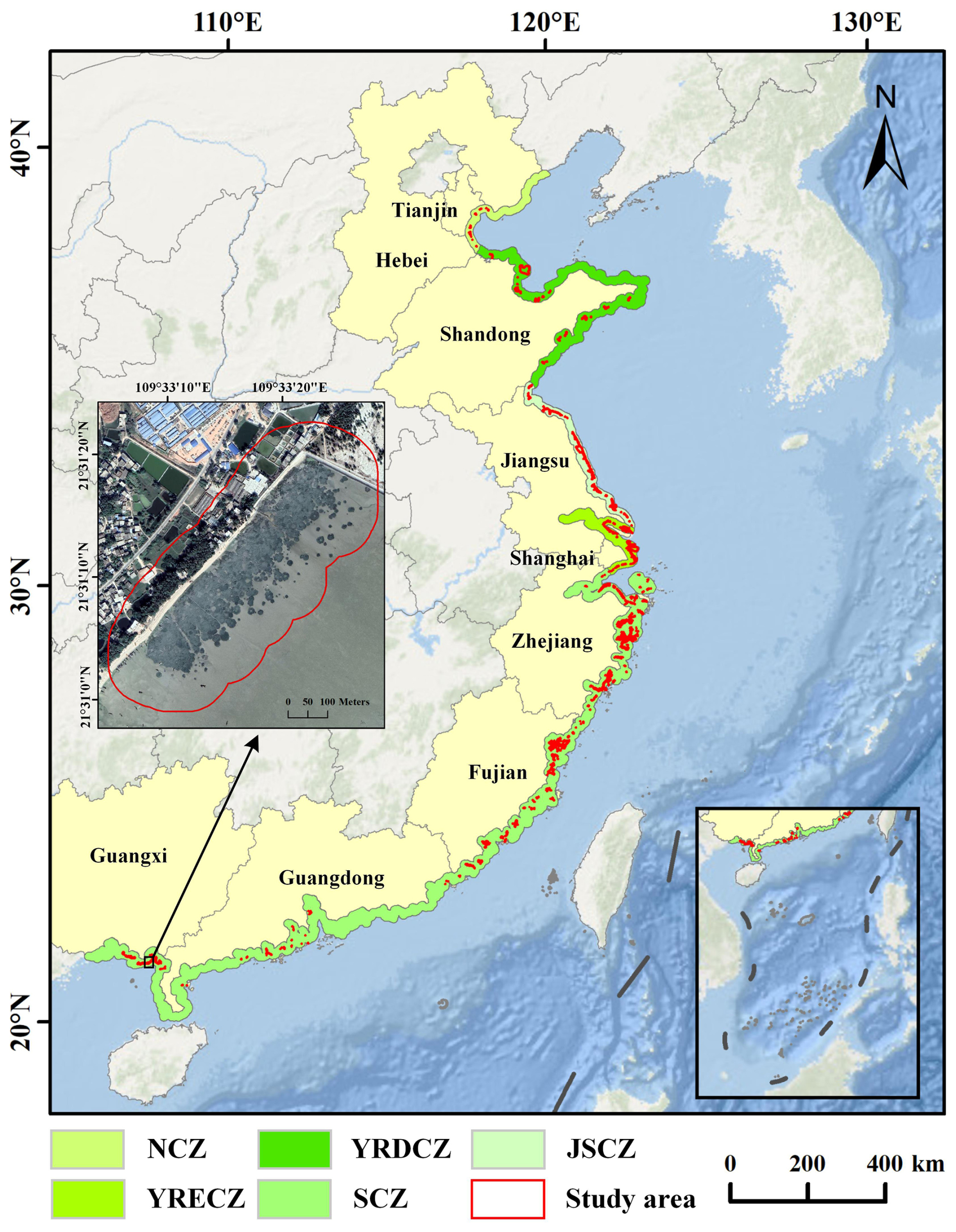 Figure 1Location of the study site in the coastal zone of mainland China. The background imagery is provided by Esri (https://www.esri.com, last access: 23 July 2025) and its data partners. The VHR imagery in the figure is from © Google Earth 2020.