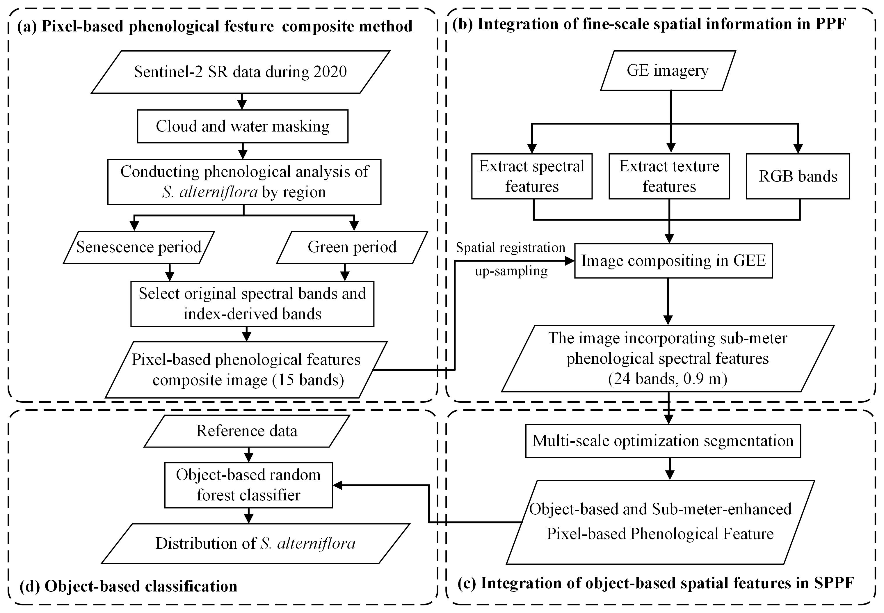 To address the spatial resolution limitations of PPF, this study introduced the SPPF composite method, incorporating fine-scale spatial information from GE imagery through three steps: GE feature extraction, spatial-scale normalization and geometric registration, and image compositing.