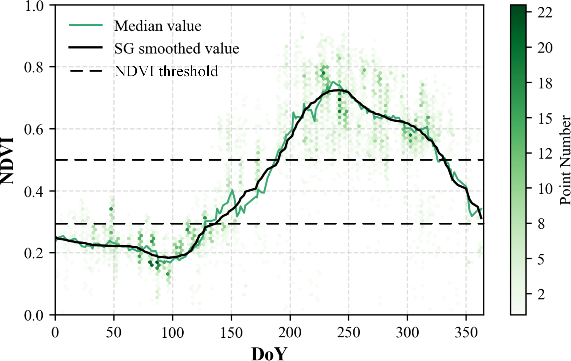 Figure 3NDVI time series analysis of the S. alterniflora in JSCZ. Point density is represented using hexagonal binning, with color intensity indicating the concentration of data points.