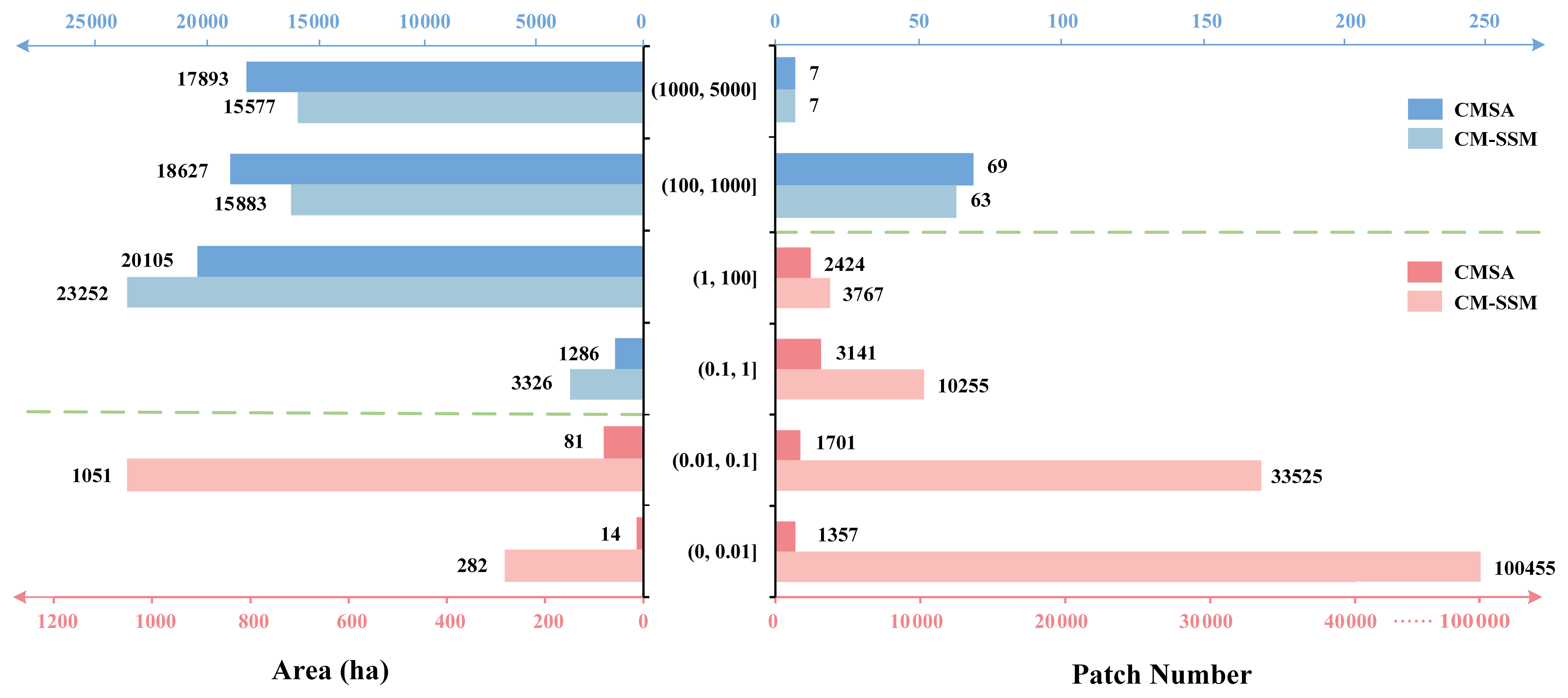 A total of 148 072 patches were identified in CM-SSM, approximately 17 times more than CMSA. The total mapped area of CM-SSM reached 59 371 ha, exceeding that of CMSA by 1365 ha. To further compare patch size and area differences between the two products, statistics were summarized across six area classes defined by the minimum mapping unit of CMSA (i.e., one 10 m pixel). These intervals included: 0.01 ha (1 pixel), 0.1 ha (10 pixels), 1 ha (100 pixels), 100 ha (10 000 pixels), 1000 ha (100 000 pixels), and greater than 1000 ha (Fig. 9). In addition, to assess spatial distribution differences, an overlay analysis was conducted using CM-SSM as the reference (Figs. 10 and 11).