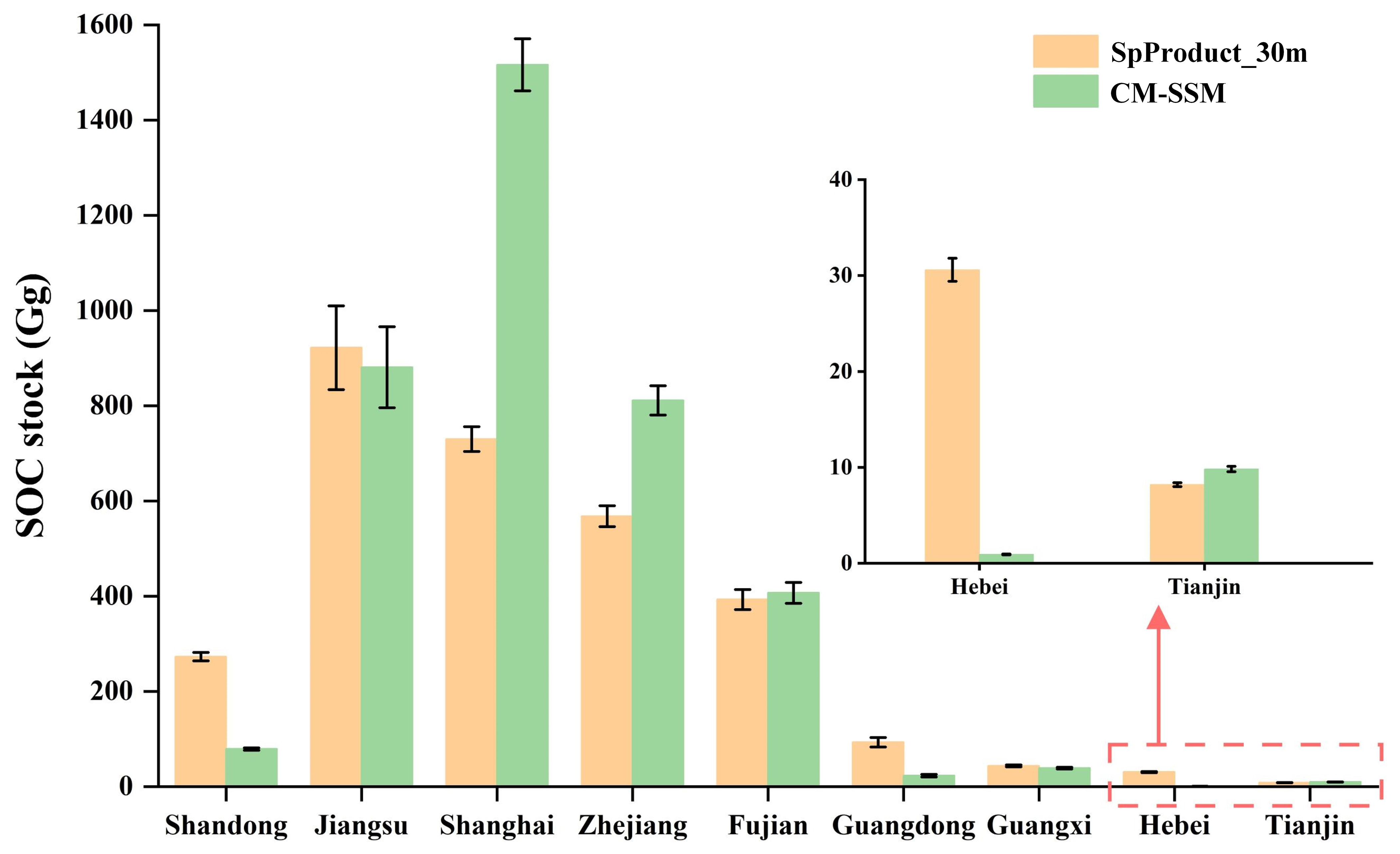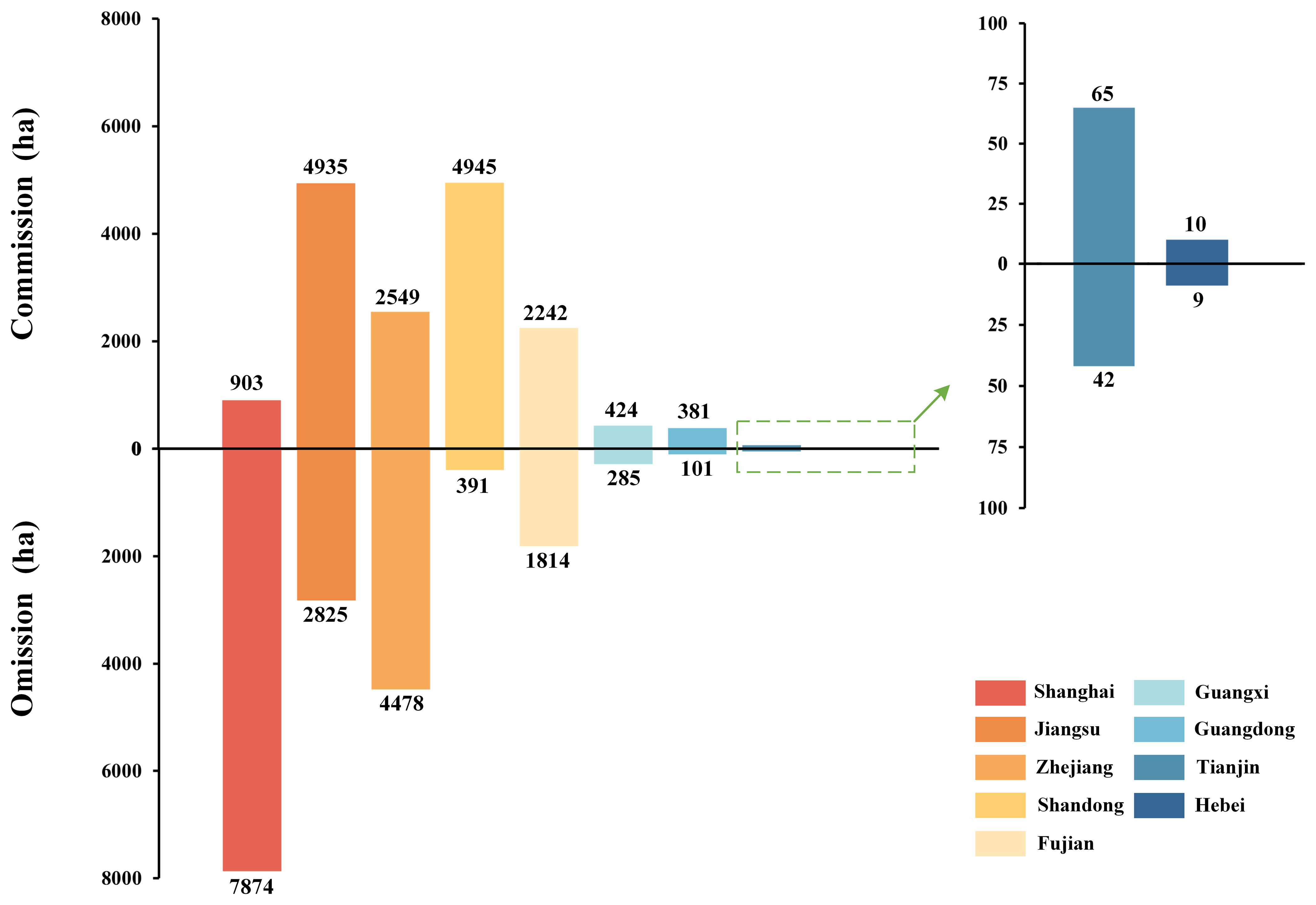 Figure 11Using CM-SSM as the reference, the commission and omission of S. alterniflora area by province were calculated for CMSA.