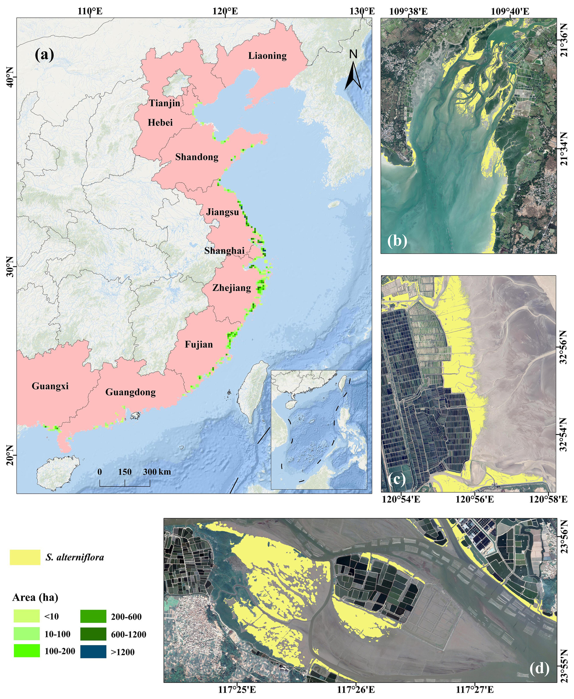 S. alterniflora is distributed across nine provinces in mainland China (20–41° N, 108–122° E), with coverage areas ranked in descending order as follows: Shanghai, Jiangsu, Zhejiang, Fujian, Shandong, Guangxi, Guangdong, Tianjin, and Hebei. Common co-occurring species include Phragmites australis, Suaeda salsa, Tamarix chinensis, and mangroves.