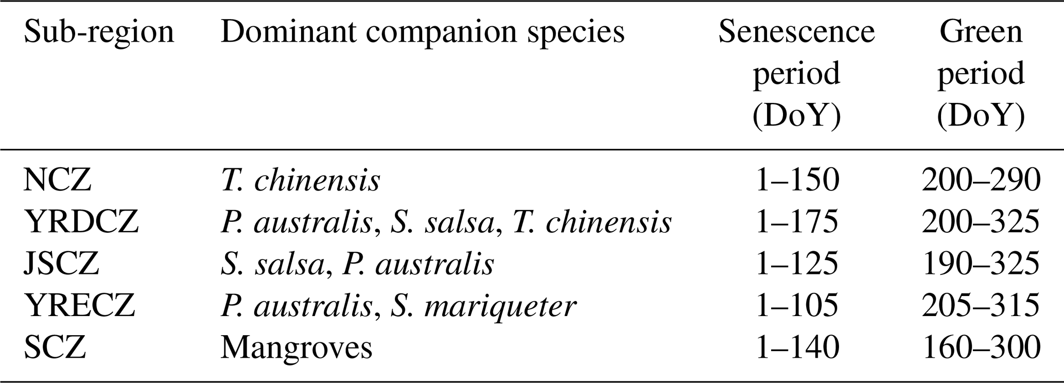 Zeng, J., Sun, Y., Cao, P., and Wang, H.: A phenology-based vegetation index classification (PVC) algorithm for coastal salt marshes using Landsat 8 images, Int. J. Appl. Earth Obs. Geoinf., 110, 102776, https://doi.org/10.1016/j.jag.2022.102776, 2022.