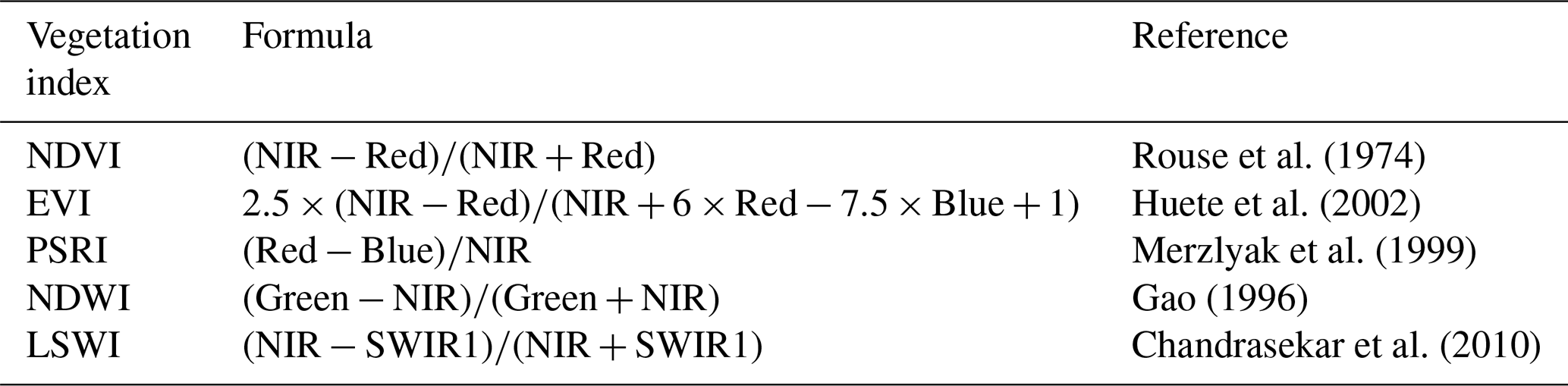 Chandrasekar, K., Sesha Sai, M., Roy, P., and Dwevedi, R.: Land Surface Water Index (LSWI) response to rainfall and NDVI using the MODIS Vegetation Index product, Int. J. Remote Sens., 31, 3987–4005, https://doi.org/10.1080/01431160802575653, 2010.