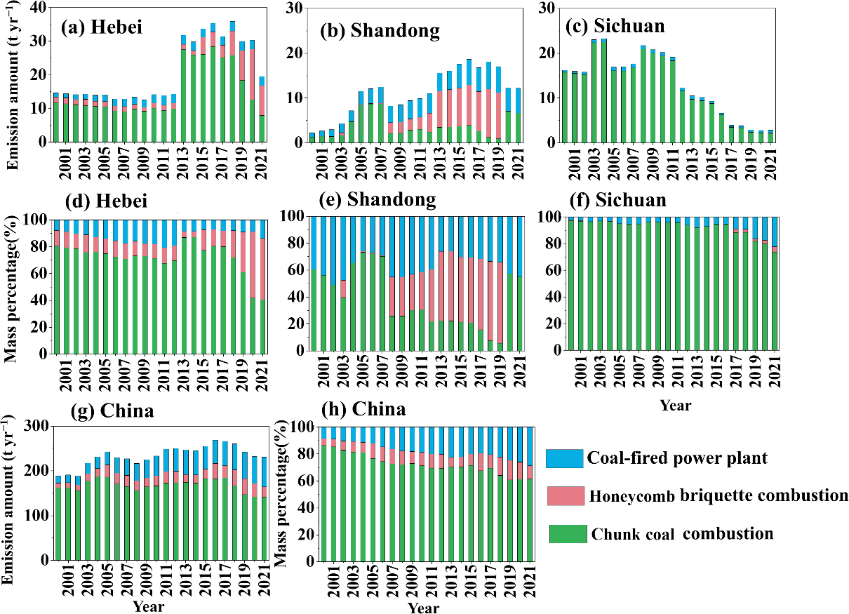 Figure 3The CFC-11 emission amounts (a–c) and mass percentages (d–f) from power plants, domestic chunk coal and honeycomb combustion in Hebei, Shandong and Sichuan, as well as those for all of China (g, h).
