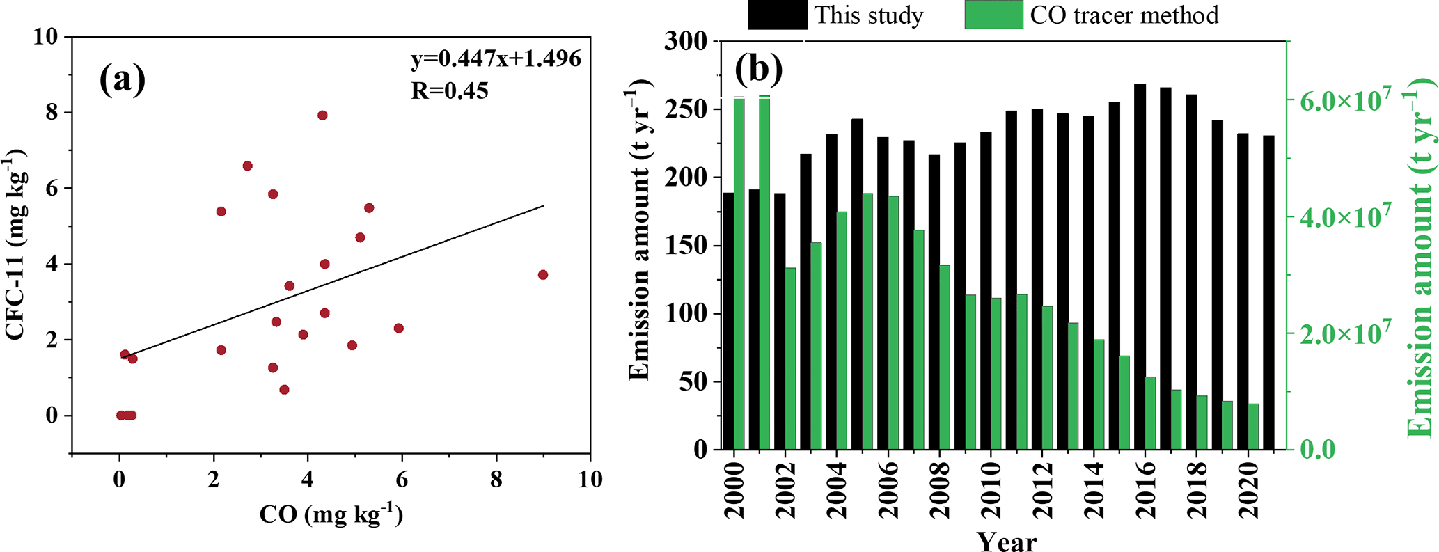 There are two popular methods frequently adopted to estimate CFC-11 emissions. The first is estimating its emissions based on an atmospheric observation dataset, including the inverse modeling approach, which identified the CFC-11 emission using two backward-running Lagrangian models, i.e., the UK Met Office Numerical Atmospheric-dispersion Modelling Environment (NAME) and the FLEXible PARTicle dispersion model (FLEXPART) (Park et al., 2021), and the ratio method, which is based on a correlation of CFC-11 with tracers holding clear emissions (Zhang et al., 2014). Many tracers have been adopted in previous studies, such as carbon monoxide (CO), chloroform (CHCl3) and carbon tetrachloride (CCl4) (Adcock et al., 2020; Huang et al., 2021). CO was often selected because its emission inventory was established well and updated frequently by MEIC (Multiresolution Emission Inventory for China, http://meicmodel.org.cn/#firstPage, last access: 12 January 2024). The essential precondition is that the CFC-11 and CO sources are co-located (Dhomse et al., 2019; Huang et al., 2021; Kim et al., 2010). However, CO is a tracer for incomplete combustion (Zeng et al., 2020). If the CFC-11 emission amounts were obtained by multiplying CO emission amounts with a CFC-11 / CO ratio from a linear fit, the results would be untenable for the following two reasons: (1) the CFC-11 / CO ratios selected varied in different studies, e.g., 0.087 (Huang et al., 2021), 0.079 (Huang et al., 2021), 0.027–0.069 (Palmer et al., 2003) and 0.022 (Shao et al., 2011). There was no objective criterion for selecting the CFC-11 / CO ratios. (2) The hypothetical co-locations of CFC-11 and CO do not mean that their sources are the same. The obtained CFC-11 emission amounts obtained through this method actually mean that CFC-11 is related only to the combustion sources.
