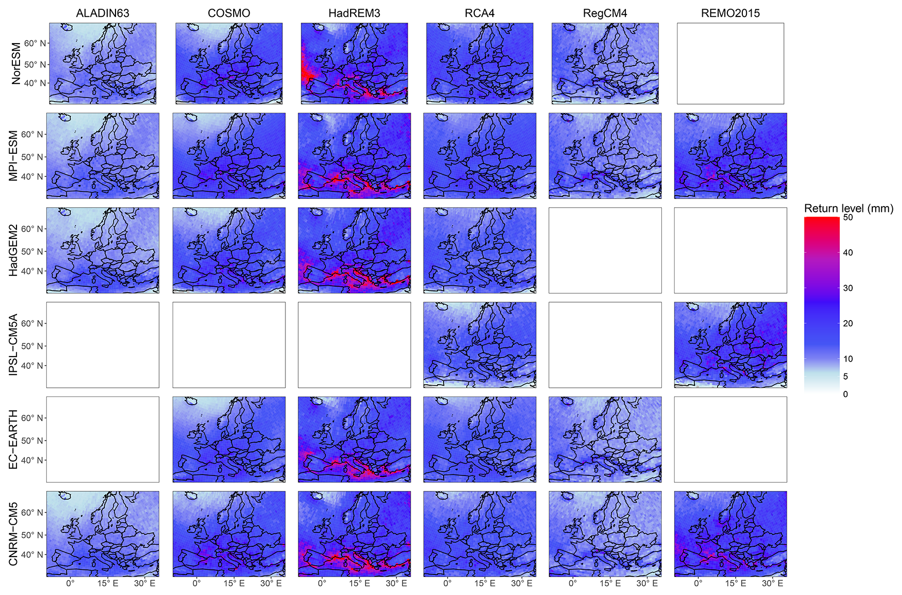 Figure 210-year return level maps of hourly precipitation in the historical EURO-SUPREME dataset for a large part of the EUR-11 CORDEX domain. Each row corresponds to a GCM and each column to an RCM. The GCM names are shortened: CNRM-CM5 stands for CNRM-CERFACS-CNRM-CM5, EC-EARTH for ICHEC-EC-EARTH, IPSL-CM5A for IPSL-IPSL-CM5A-MR, HadGEM2 for MOHC-HadGEM2-ES, MPI-ESM for MPI-M-MPI-ESM-LR and NorESM for NCC-NorESM1-M. Some of the RCM names are shortened as well: COSMO stands for COSMO-crCLIM and HadREM3 for HadREM3-GA7-05. The red colour is used for all values above 50 mm and the maximum value found is 77.8 mm.