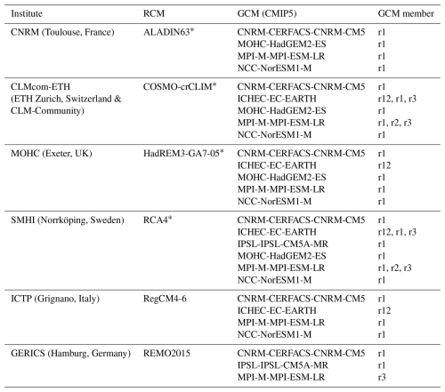 Table 1Summary of the 27 EURO-CORDEX GCM-RCM pairs that are included in the EURO-SUPREME dataset.* The reanalysis-driven evaluation run, downscaled from ERA-Interim (ECMWF), is available.