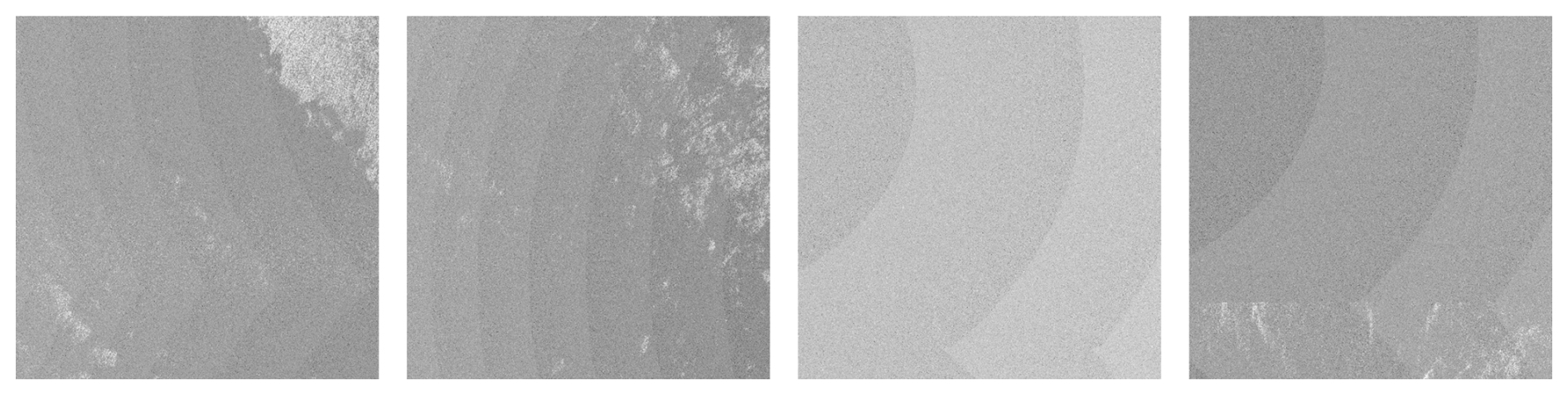 Figure 2Image patches in the dataset with artifact as shown in Fig. 1. The tags for these image patches (from left to right) for referring to their information in the provided data table are nw-0603-03-000100, nw-0609-03-000106, nw-0547-03-000044, and nw-0553-03-000050 (see also Sect. 2.2 and Appendix A). The figure contains modified Copernicus Sentinel data (2019).