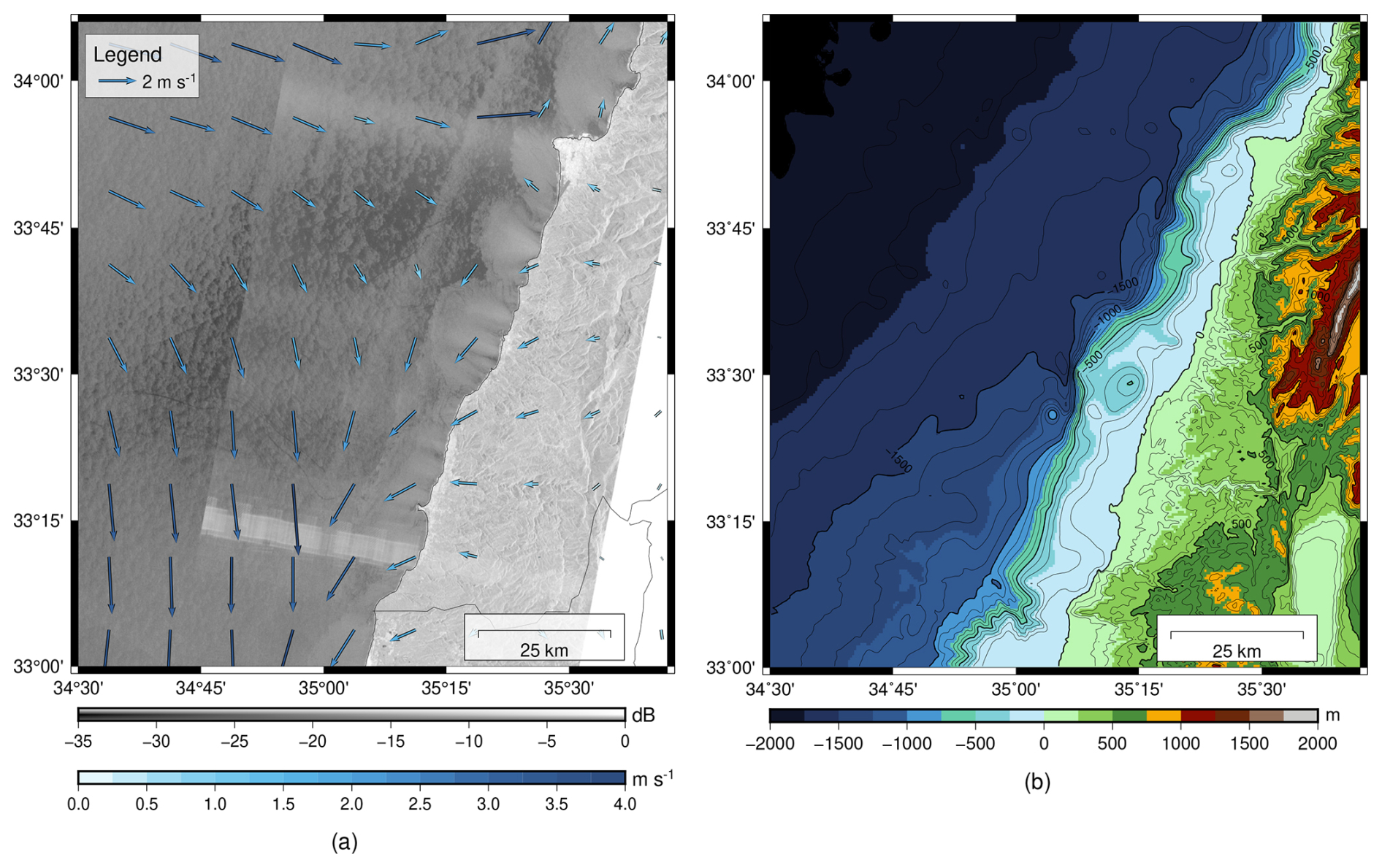 Figure 9(a) An example of katabatic wind-induced signatures in the SAR scenes taken at 03:43 on 24 September 2022 near Lebanon, plotted with the simulated wind speed at 04:00 obtain from CMEMS and MDS (2024c). The figure contains modified Copernicus Sentinel data (2022); the coastline and borders were obtained from Wessel and Smith (1996). (b) Bathymetry and terrain models obtained from GEBCO Bathymetric Compilation Group (2023).