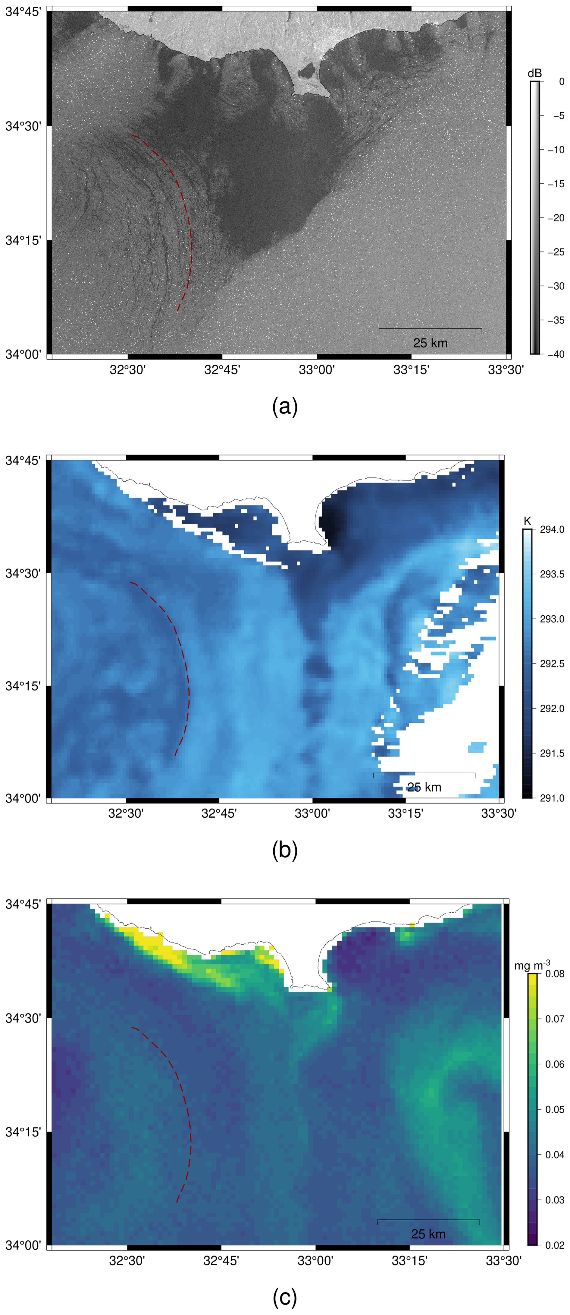 The following subsections illustrate and explain SAR signatures due to oil slicks, different oceanic or atmospheric phenomena, or human-related activities. Some supporting materials listed in Table 2 are used to comprehend the phenomena and to better interpret the SAR signatures. If users need more detailed information about the supporting data, they should check the descriptions in Sect. 2.3 or refer to the websites in Table 2. Note that these examples are not provided in the published dataset. The published dataset only includes image patches from 2019; however, the examples are not limited to the time interval. The selections are mainly based on the accessibility of the supplementary materials and are to avoid SAR signatures due to multiple phenomena, which make it challenging to interpret. These examples are not cropped into image patches as most phenomena influence an area larger than the size of an image patch. In addition, instead of displaying them in SAR geometry in range and azimuth, they were projected to the World Geodetic System 1984 (WGS84), making it easier to compare them with different supplementary data. All the example scenes are listed at the end of this section (Sect. 4.9), so that users can download SAR scenes themselves from the Copernicus Data Space Ecosystem.