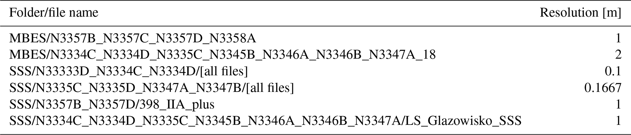 Table 1MBES and SSS datasets with non-standard resolutions or incomplete coverage, including data from previous surveys (Słupsk Bank and Koszalin Bay) integrated into the overall dataset.
