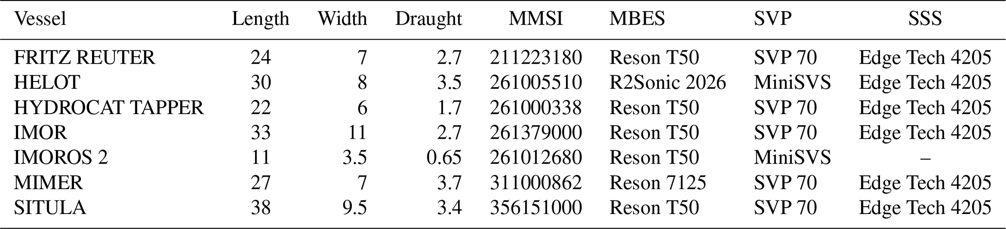 Bathymetric and SSS surveys were performed in the period from 28 April 2022 to 5 December 2023; from aboard the following seven vessels: FRITZ REUTER, HELOT, HYDROCAT TAPPER, IMOR, IMOROS 2, MIMER, SITULA. Table 2 provides a summary of all vessels conducting data acquisition with their specifications and measuring equipment (MMSI – Maritime Mobile Service Identity). All measurements were acquired within the PL-EVRF2007-NH height reference level and ETRS89/Poland CS92 reference system based on the WGS 1984 ellipsoid. Positioning of vessels and their measurement systems was conducted using the following approaches: RTK DGPS positioning with the ASG EUPOS correction system, inertial positioning with motion, heading, and acceleration sensors, and USBL (Ultra-Short Baseline) underwater positioning. All hydroacoustic data acquisition surveys were performed in accordance with the IHO (International Hydrographic Organization) S-44 1a order (International Hydrographic Organization, 2020, 2022).