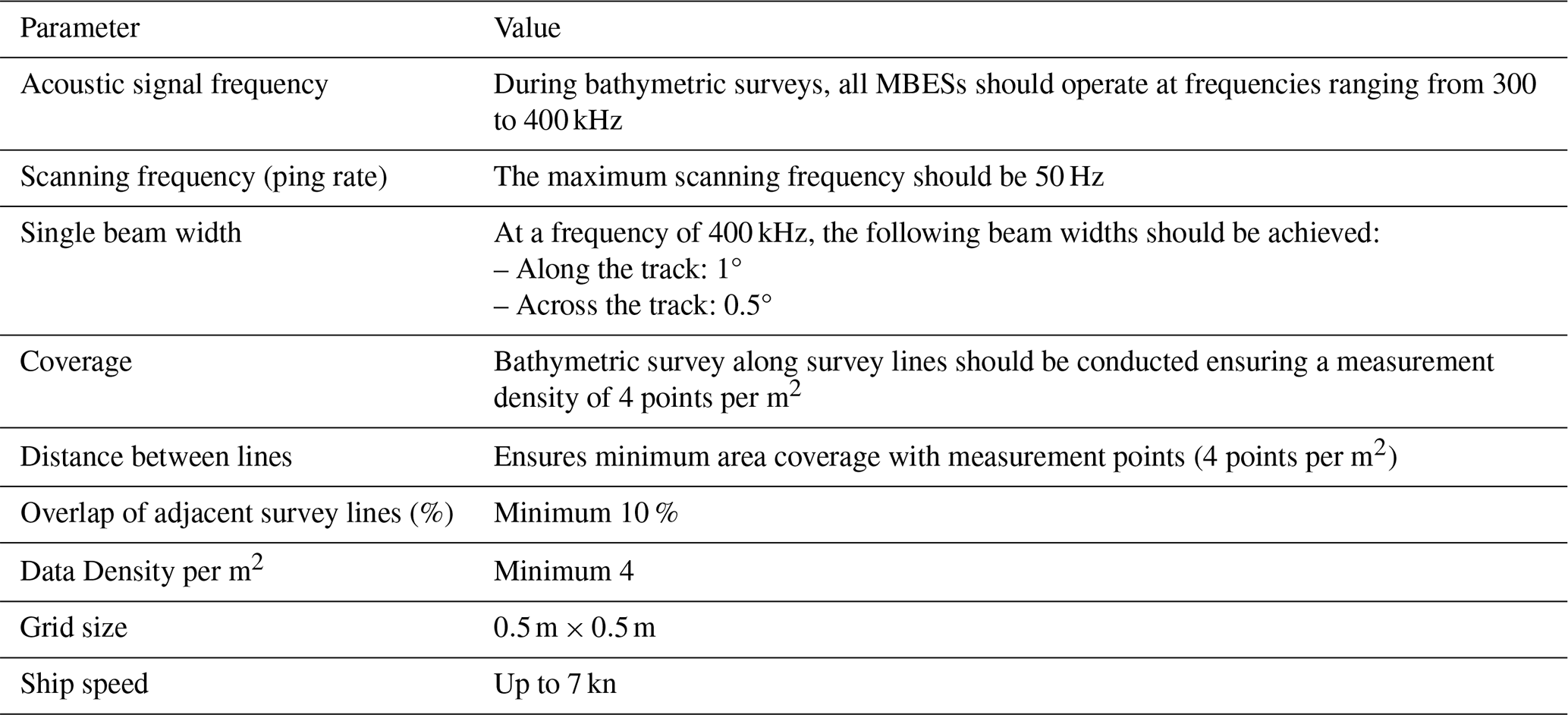 The project's quality requirements stipulated that at least one actual bathymetric measurement should be in 95 % of the pixels of the resulting raster grids (with pixel sizes of 50 cm×50 cm or 20 cm×20 cm for SSS measurements). Maximum vessel speeds were set at 7 kn for MBES-only surveys and 4.1 kn for combined MBES/SSS surveys (at 65 m sonar range), with operators adjusting speeds to maintain ≥20 measurement points per meter across-track and ≥5 % swath overlap.