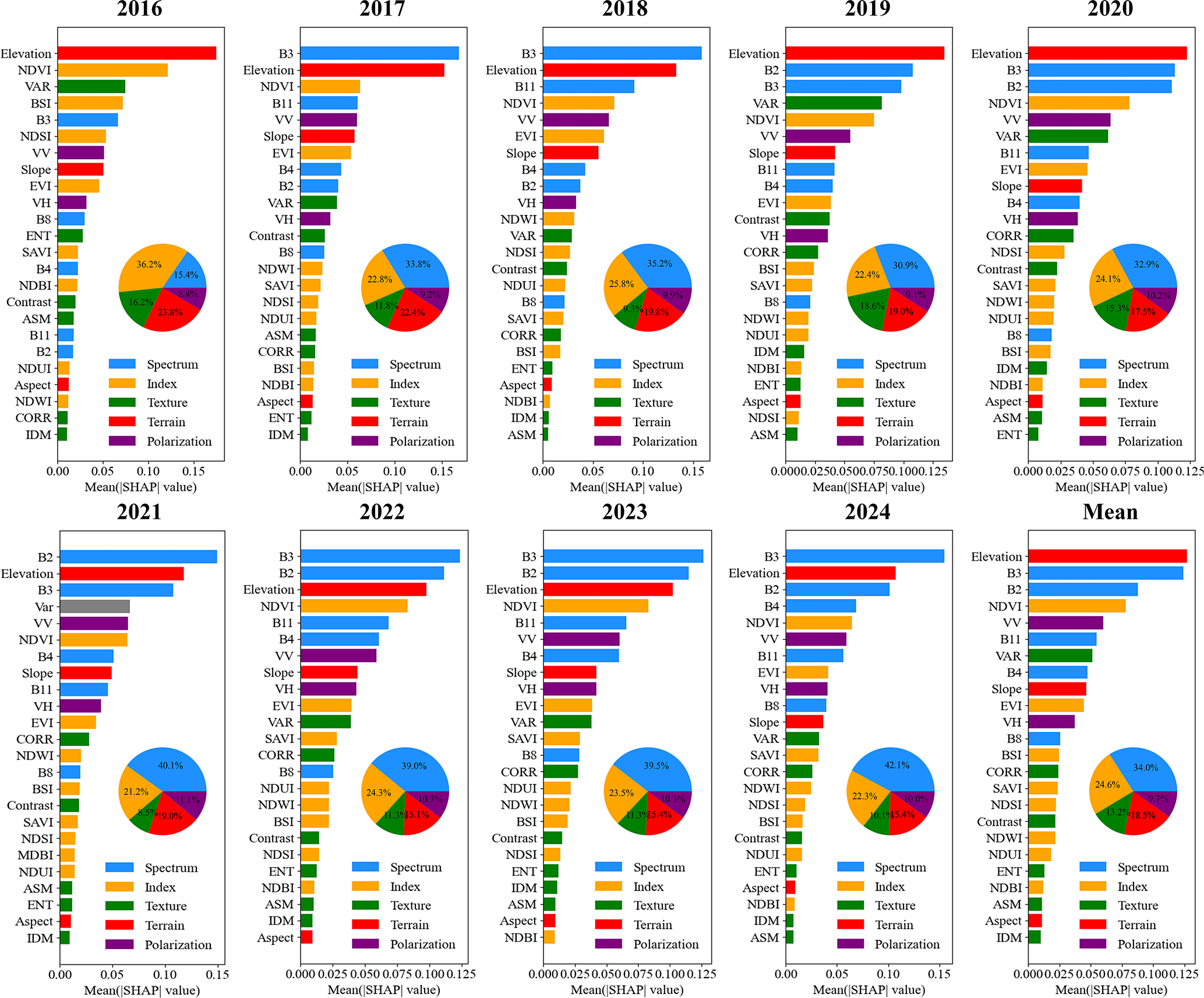 We evaluated the importance of model variables for the years 2016–2024 (Fig. 7). Based on the average importance ranking from 2016 to 2024, the top five features were . When classified by feature category, the highest average importance was found in spectral features (0.3403), followed by index features (0.2458), topographic features (0.1847), texture features (0.1317), and polarization features (0.0975). The most important feature in each category was as follows: Elevation for topographic features, B3 for spectral features, NDVI for index features, VV for polarization features, and VAR for texture features.