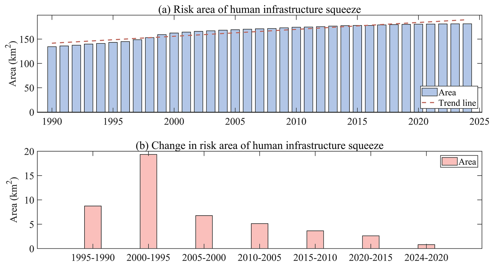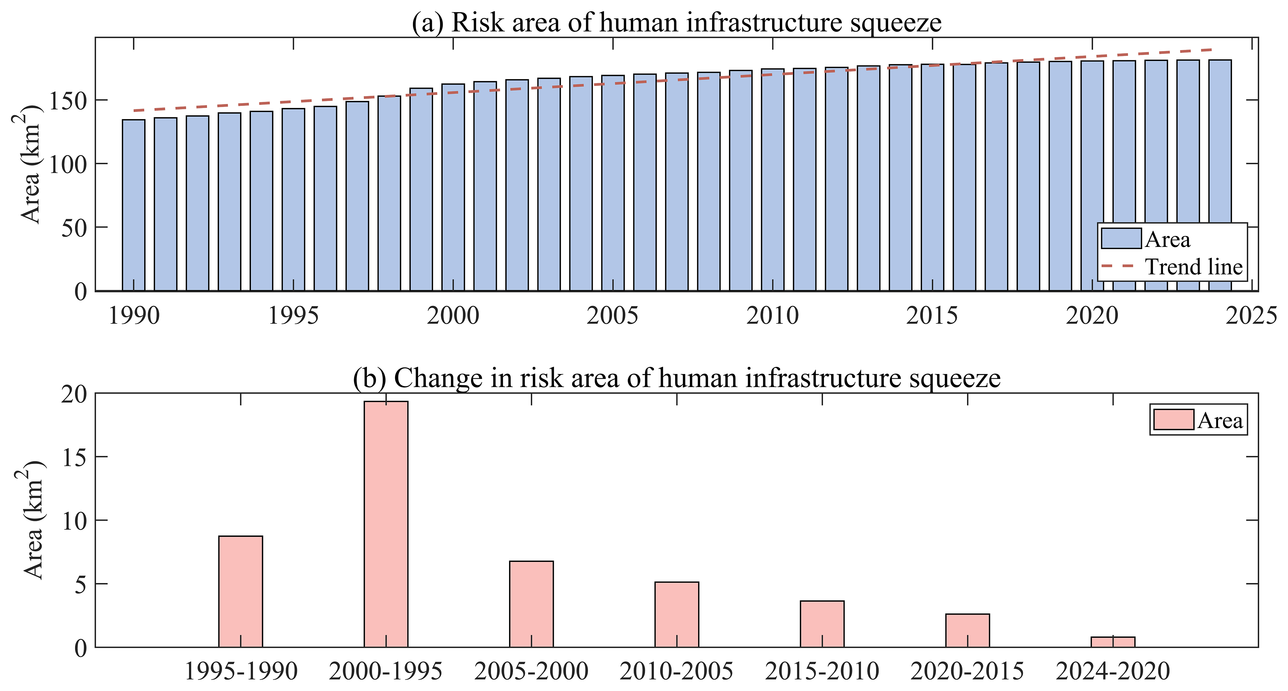 We calculated and analyzed the temporal changes in the risk areas affected by human infrastructure squeeze in the study area (Fig. 10). From 1990 to 2024, the risk area increased annually due to human infrastructure development (e.g., ports, dams, and coastal development). The area rose from 134.39 km2 in 1990 to 181.42 km2 in 2024, a total increase of about 47.03 km2. The most significant increases occurred between 1995–2000, with a nationwide increase of approximately 19.34 km2 in human infrastructure squeeze risk areas during this period. However, the growth rate has slowed in recent years, with only a 0.80 km2 increase from 2020 to 2024, indicating stabilization due to enhanced regulation or resource saturation.